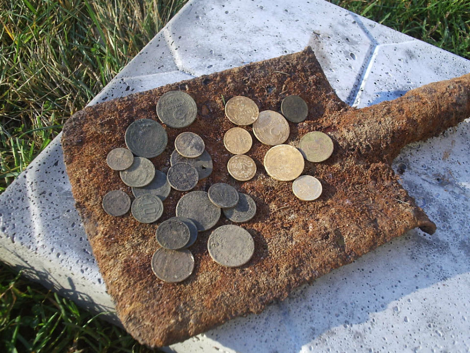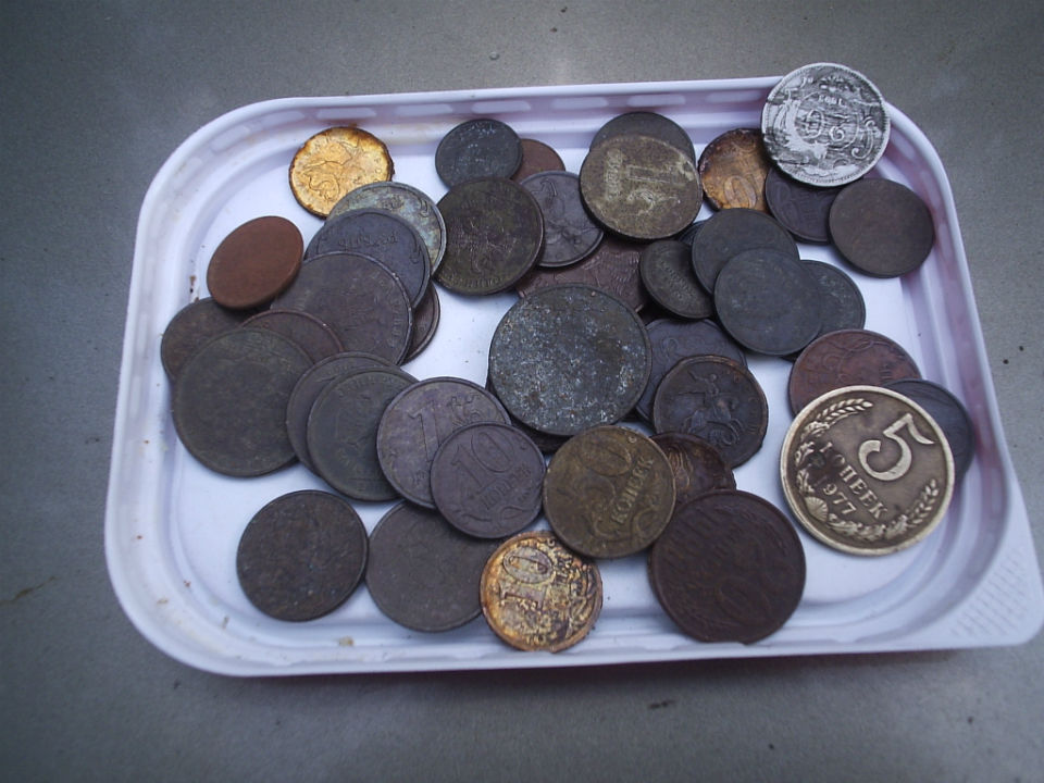 Пять копеек я немного почистил поэтому так блестит.Ну а другие монеты от долгого лежания в земле и песке окислились и потемнели.