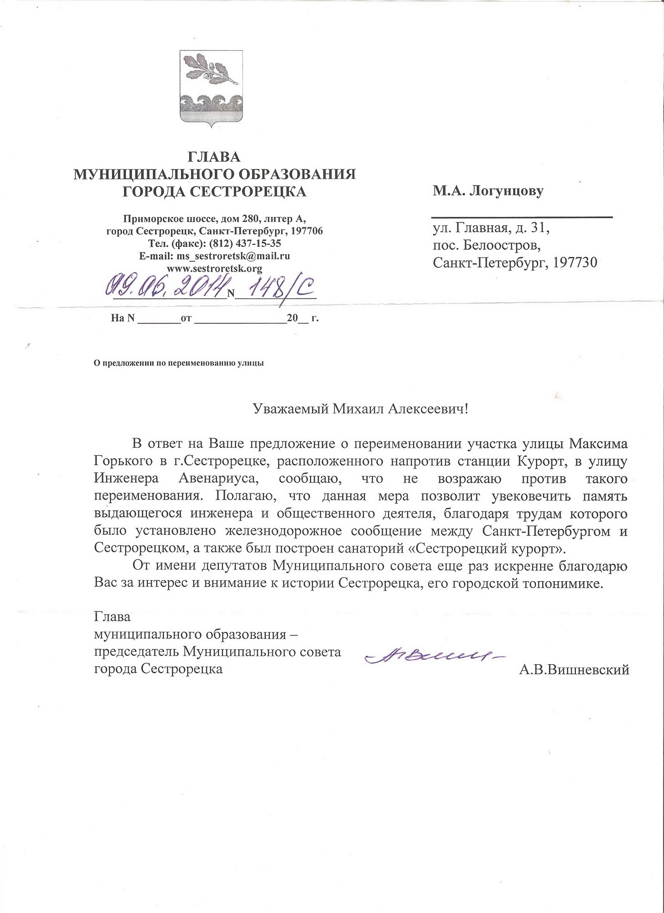 Сегодня получил ответное письмо от Главы Сестрорецка Вишневского А. В. (от 09.06.2014 №148/с)краевед эксперт писал(а):12 мая 2014г. мною было направлено очередное письмо Главе МС Сестрорецка Вишневскому .......