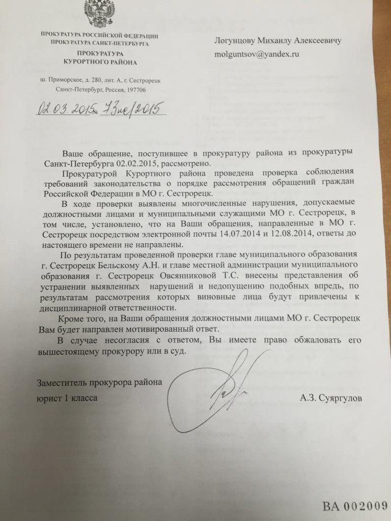 Сегодня направил повторное письмо по эл. почте в Прокуратуру Курортного р-на.