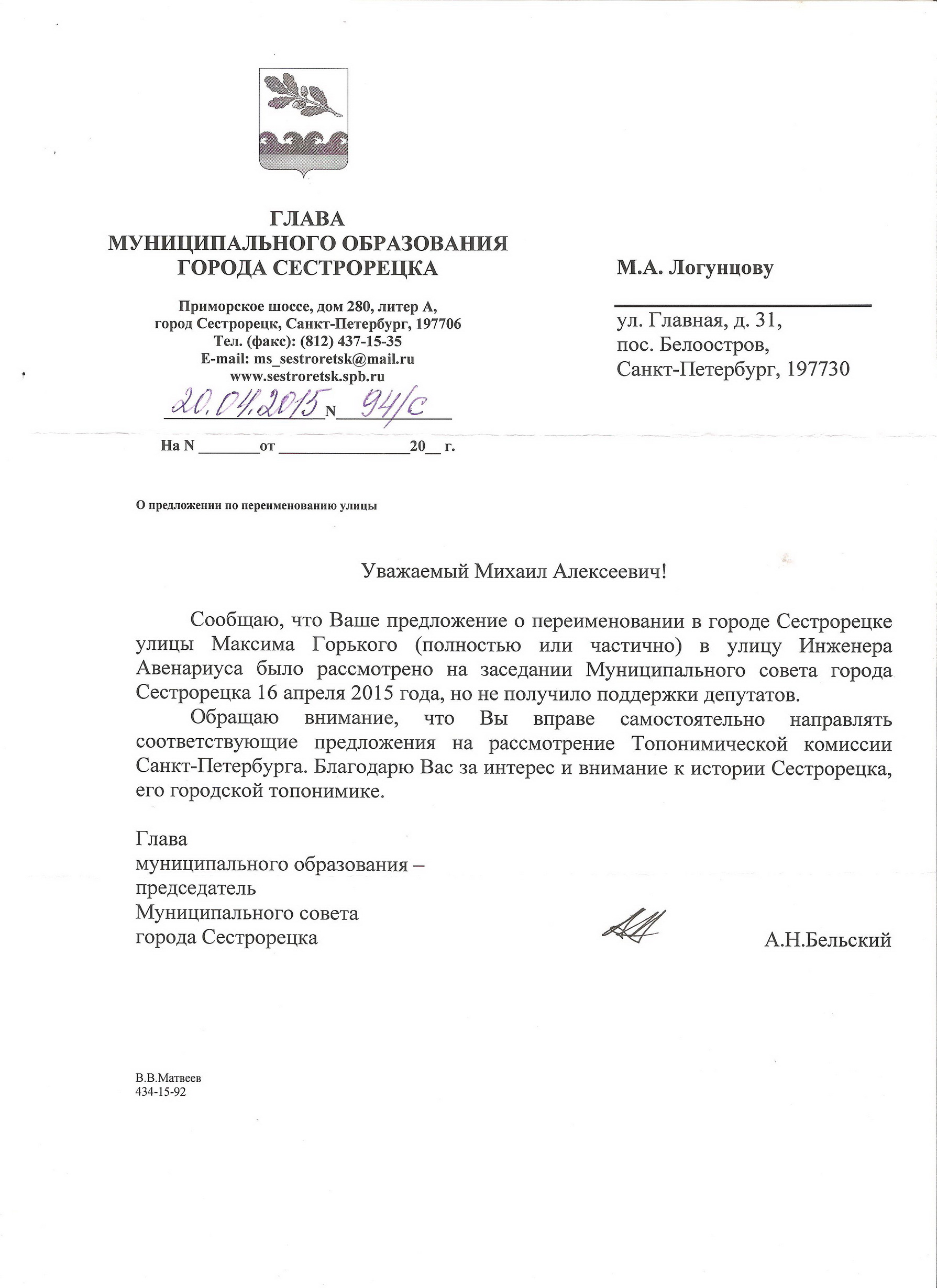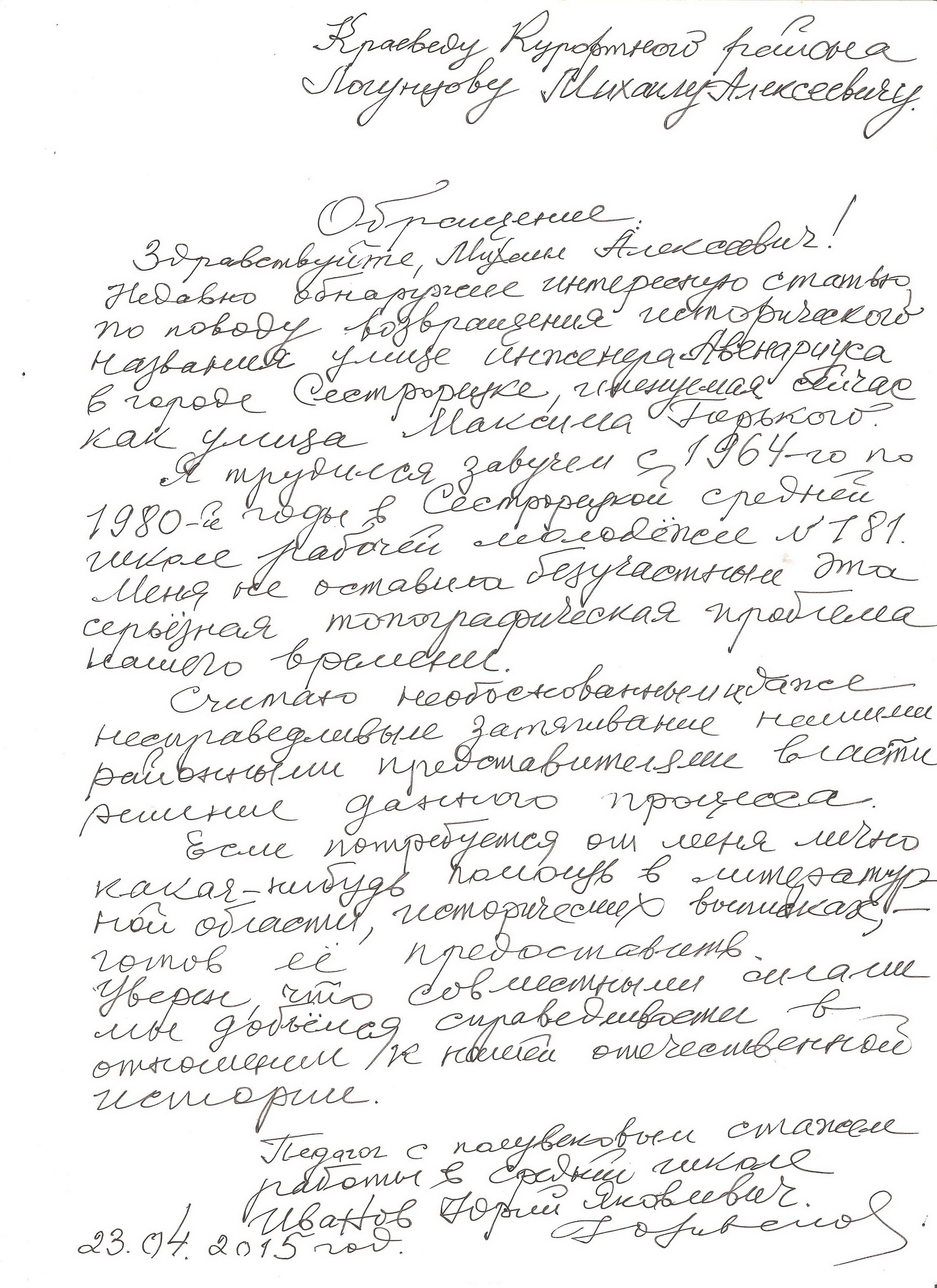 Для пояснения вопроса - решил дополнить свое предыдущее сообщение и прикрепил исходящее письмо от конца января 2015г., на которое был получен ответ из прокуратуры от 02.03.2015г.краевед эксперт писал(а):С момента последнего сообщения в этой теме прошло 6 месяцев. К сожалению, сотрудники МС Сестрорецка с которыми я переписывался и перезванивался в этот период кормили меня только обещаниями о положительном решении по этому вопросу. В итоге в конце января 2015г. мне пришлось обратиться в прокуратуру Курортного р-на с жалобой на МС Сестрорецка в части решения вопроса об историческом возвращении исторического названия части улицы (ныне М. Горького) инженера Авенариуса, а также об установления бюста Авенариуса у главного входа в санаторий Сестрорецкий Курорт (нужно было сделать это 5 месяцев назад). .....