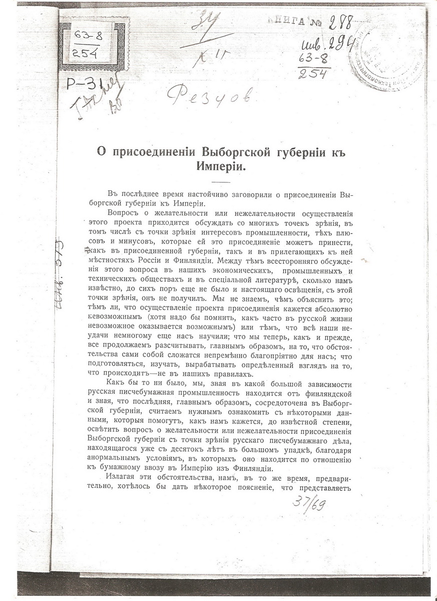 Нашел статью от 1909г. городского главы Петербурга Николая Александровича Резцова (1855-1914) /см. биографию http://www.nizrp.ru/reztsov.php/, в которой он анализирует вопрос о возможности присоединения Выборгской губернии к Российской империи в 1909 -1910г.г. и высказывает свое отрицательное отношение к такому присоединению.краевед эксперт писал(а):Прочитал мирный договор от 14 октября 1920г. и обратил внимание на начало текста в части провозглашения самостоятельности в 1917г. и признании Финляндии.