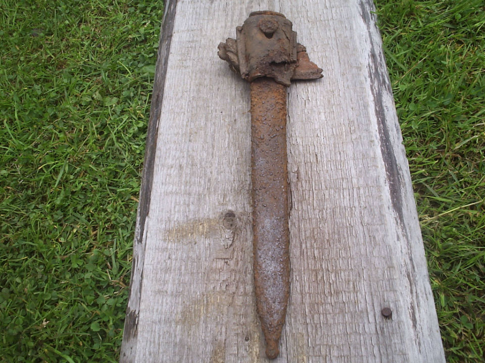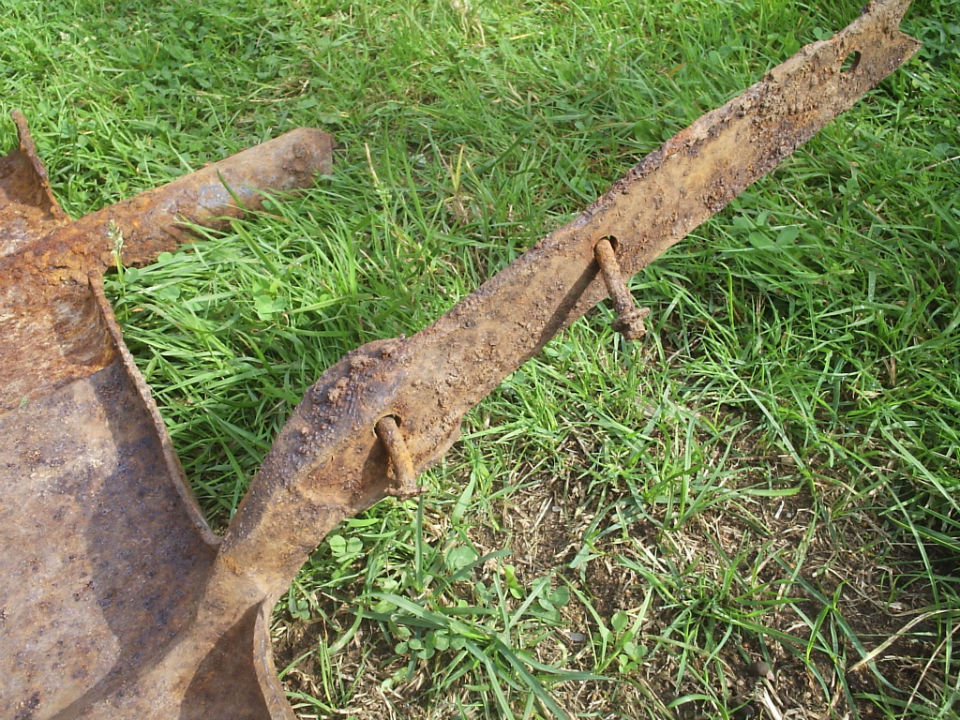 - Черенок крепился на необычной ручке с заклепками.
