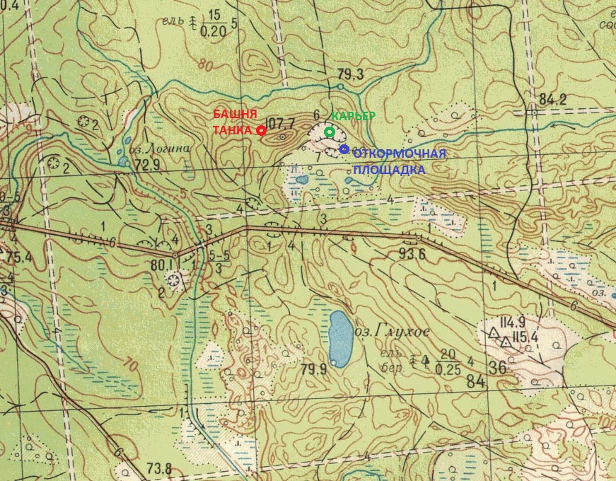 Отметил место на карте. Это у высоты 107,7. С северной стороны высоты ( там она очень крутая, высотой метров 20) проходит тропинка. На тропинке прямо под горкой и лежала эта башня. Раньше мы там ходили- ее не было.
