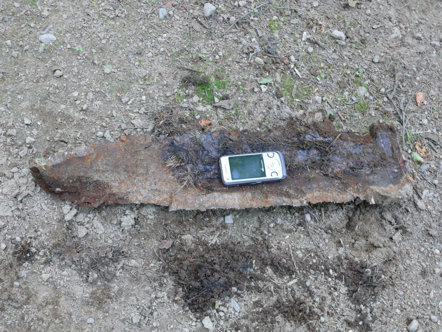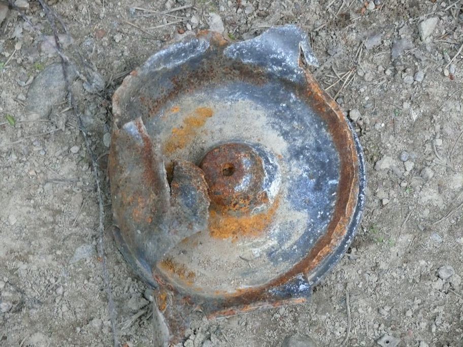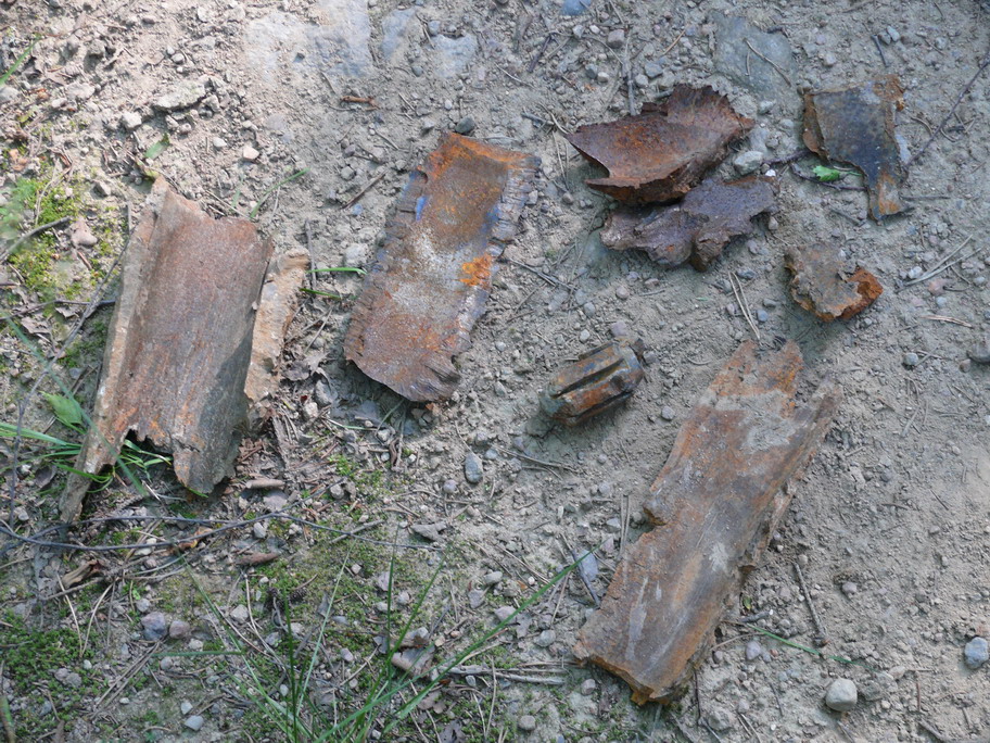 В начале июня уже этого года во время прогулки по изучению достопримечательностей попал я снова на эту дорогу.Да-а-а похоже за зиму сильно утилизировали боеприпасы.Дорога сплошь усеяна осколками разного размера от самых различных боеприпасов.Каких там только нет железяк.Сделал в спешке несколько фото так как особого желания оставаться на этой дороге не было.Взрывать могли начать в любую минуту.В прошлом году осколки падали мне кажется по другой траектории в лес, а не на дорогу.