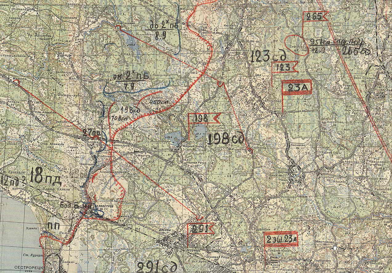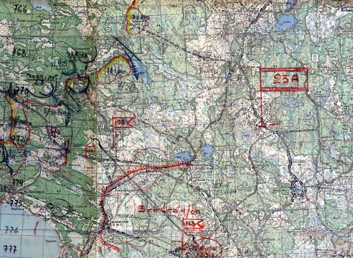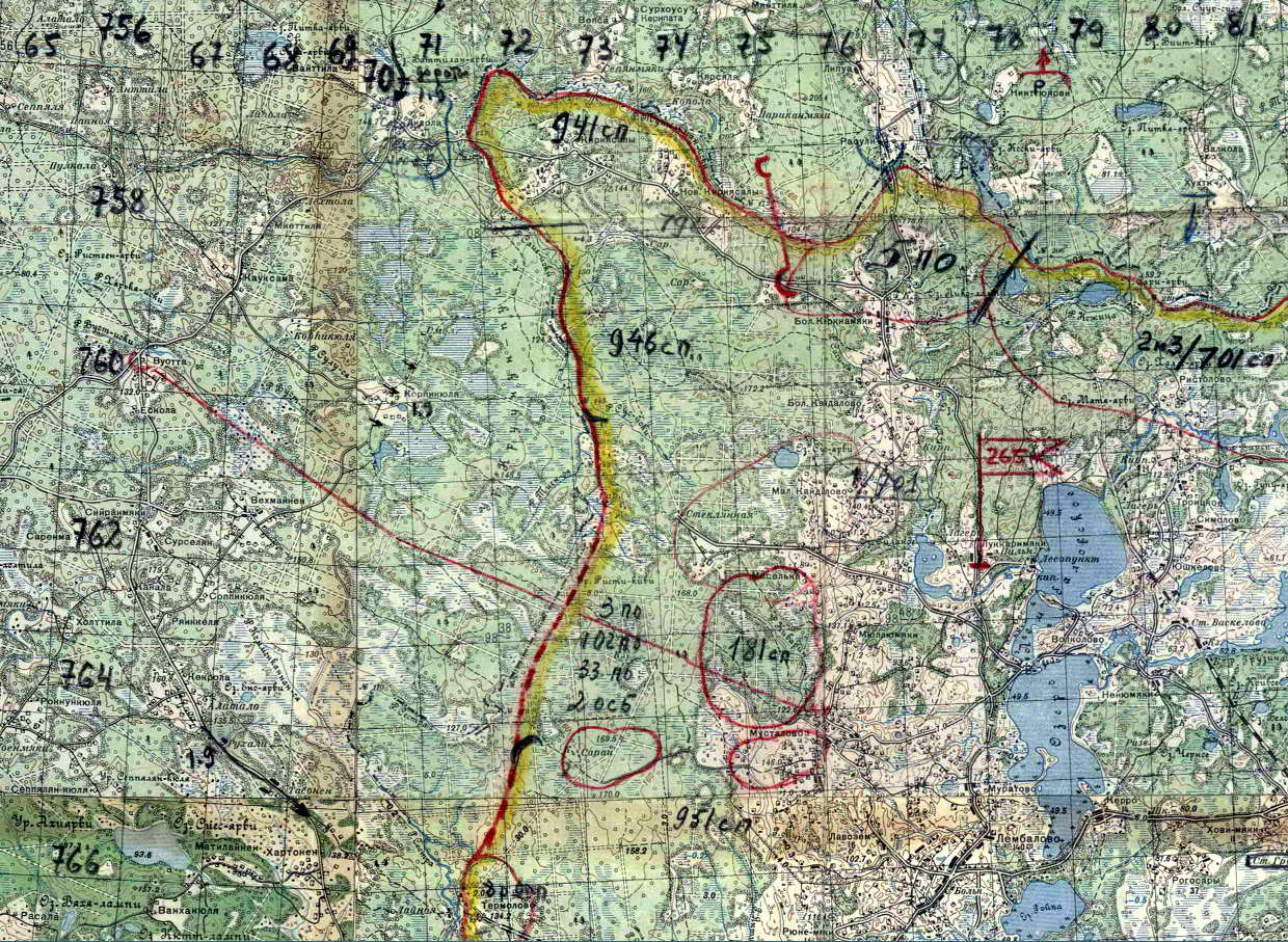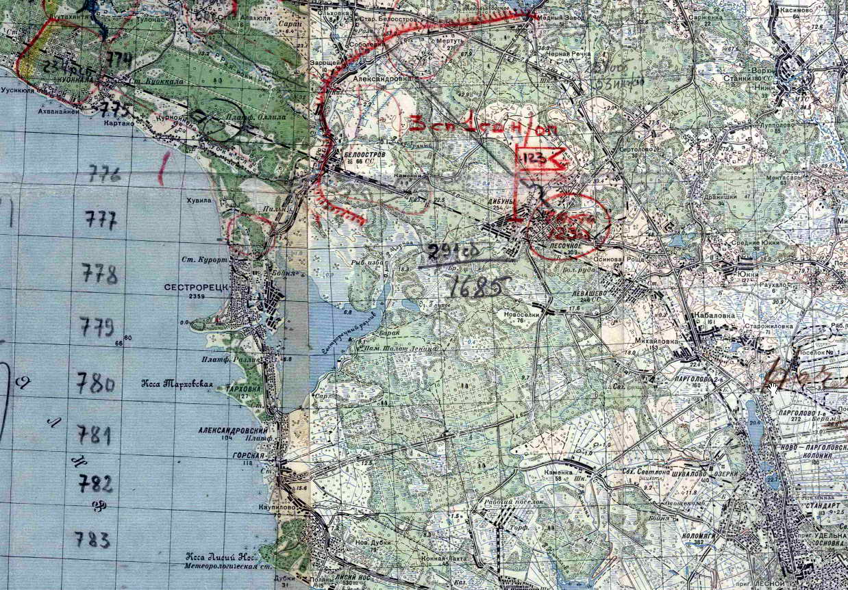 Посмотрев эту карту и расположение флажка, сообразил, что ранее проявил неграмотность и толковал документ буквально . В документе место штаба указано районом, по ближайшим ориентирам - деревне и высоте. Было бы действительно странным располагать его на высоте, в чистом поле. Фактически же -и карта это подтверждает - он располагался, скорее всего, в имевшихся тогда вдоль дороги на Каллелово строениях. Т.е. слева от нынешнего "Озёрного шоссе", где-то м-ду ж.-д магазином и "Пеньками". И всего-то двое суток, после чего переехал в Медный Завод.