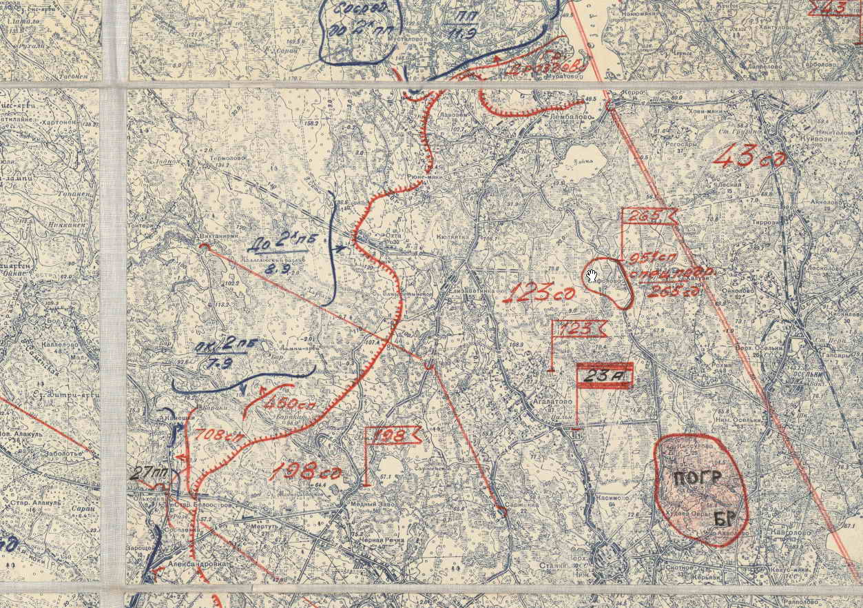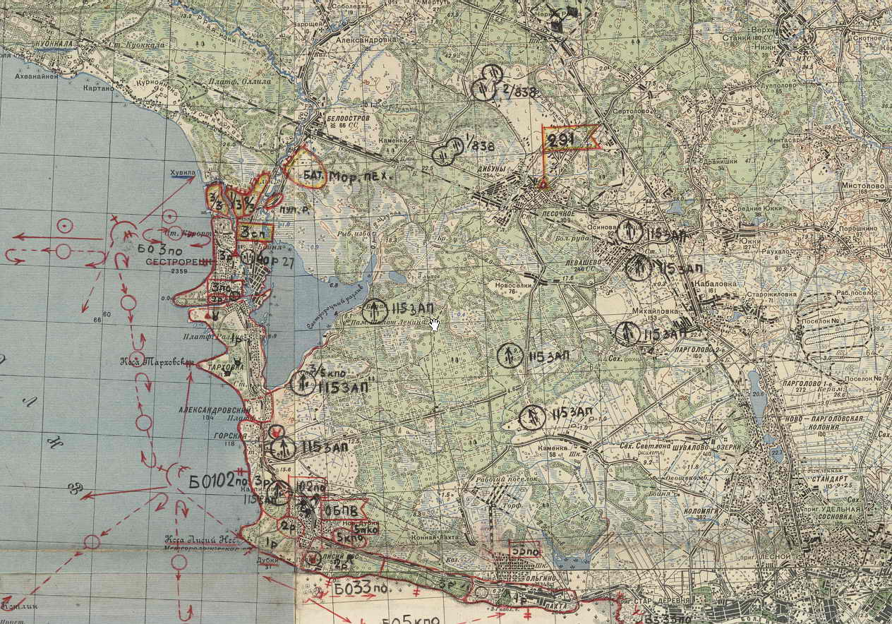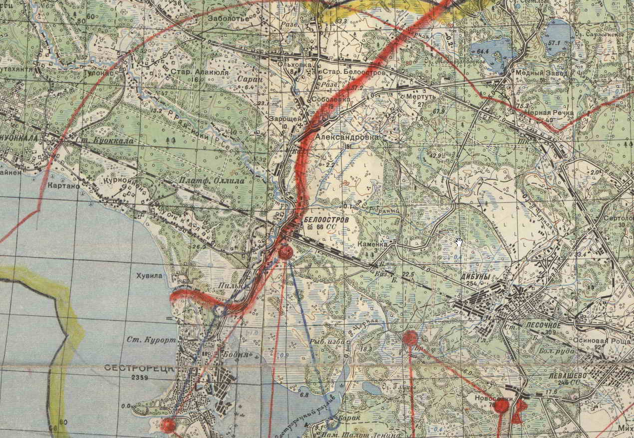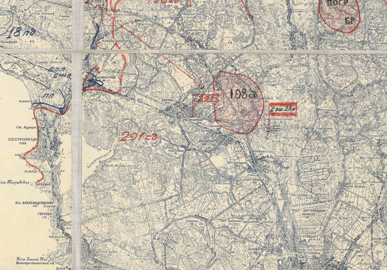 Посмотрев эту карту и расположение флажка, сообразил, что ранее проявил неграмотность и толковал документ буквально . В документе место штаба указано районом, по ближайшим ориентирам - деревне и высоте. Было бы действительно странным располагать его на высоте, в чистом поле. Фактически же -и карта это подтверждает - он располагался, скорее всего, в имевшихся тогда вдоль дороги на Каллелово строениях. Т.е. слева от нынешнего "Озёрного шоссе", где-то м-ду ж.-д магазином и "Пеньками". И всего-то двое суток, после чего переехал в Медный Завод.