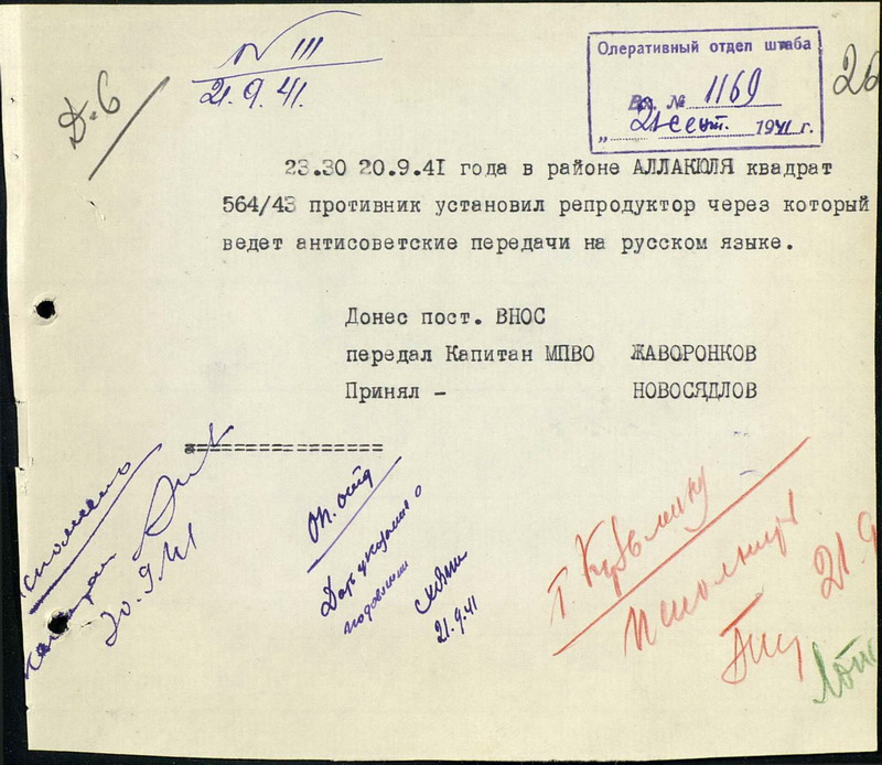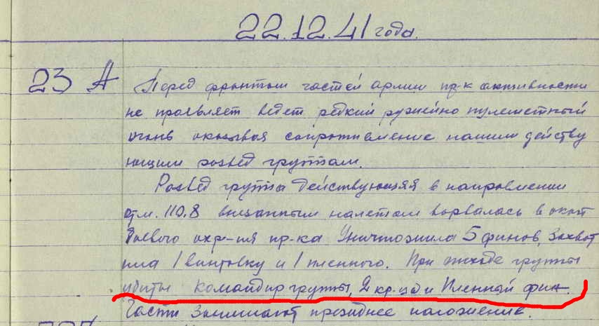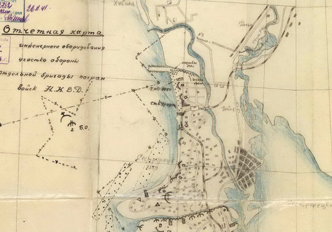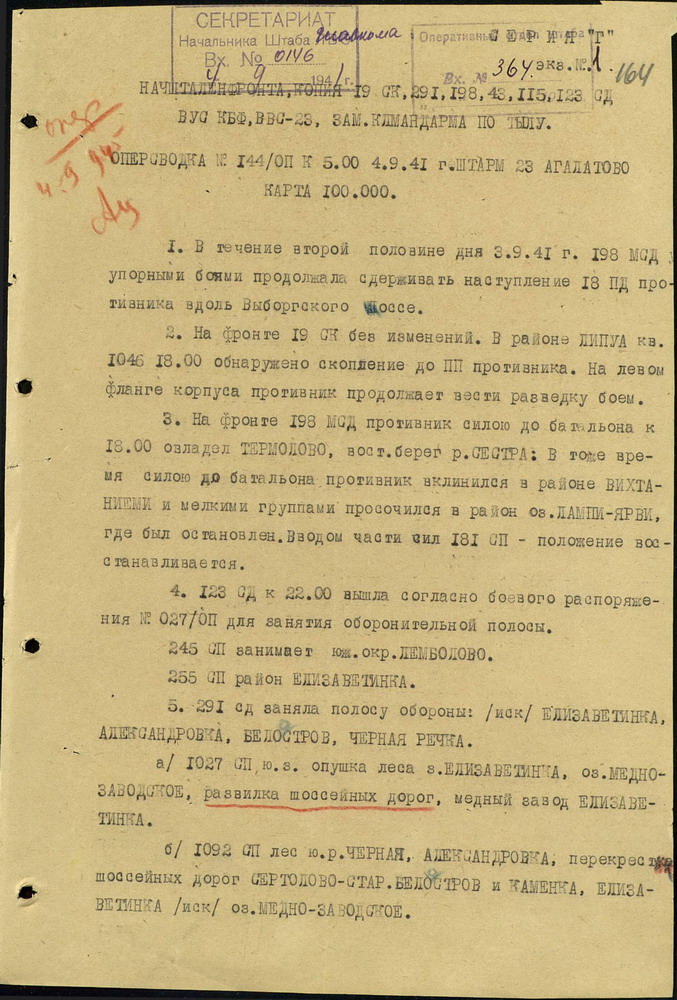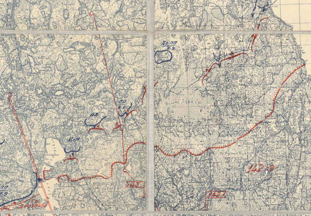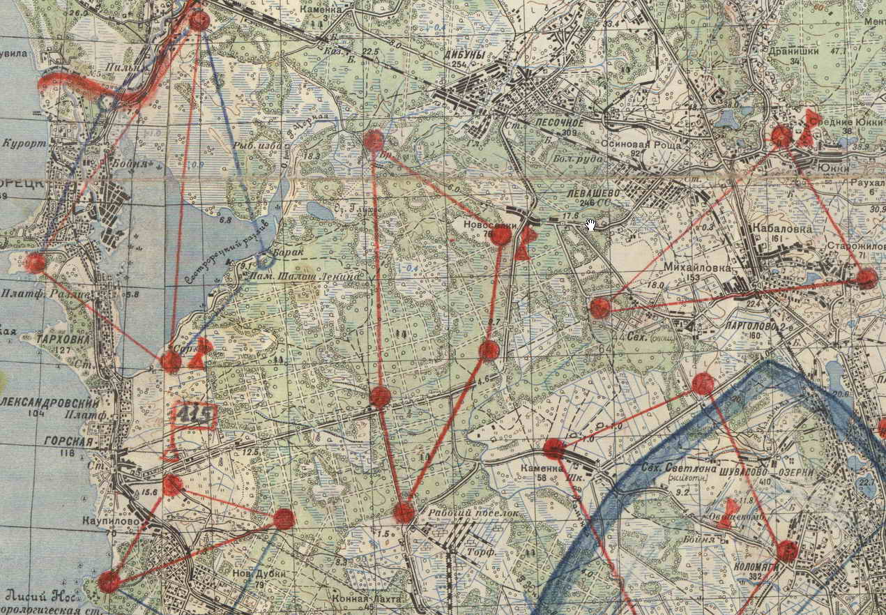 Посмотрев эту карту и расположение флажка, сообразил, что ранее проявил неграмотность и толковал документ буквально . В документе место штаба указано районом, по ближайшим ориентирам - деревне и высоте. Было бы действительно странным располагать его на высоте, в чистом поле. Фактически же -и карта это подтверждает - он располагался, скорее всего, в имевшихся тогда вдоль дороги на Каллелово строениях. Т.е. слева от нынешнего "Озёрного шоссе", где-то м-ду ж.-д магазином и "Пеньками". И всего-то двое суток, после чего переехал в Медный Завод.