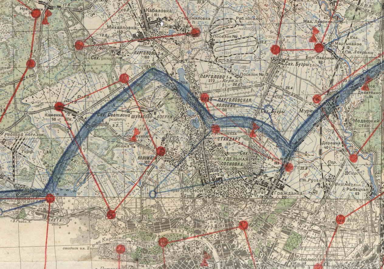 Синим обозначена граница расположения аэростатов заграждения. Кстати, один из аэростатов упал где-то в районе Белоострова в сентябре. Видимо сорвало с тросов и отнесло.