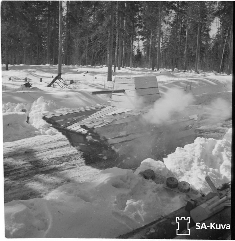 Перед атакой по доту-великану вела огонь наша артиллерия большой мощности. Каковы результаты ее работы? Многоэтажный дот, имевший стенки в полтора-два метра толщины, разрушен почти до основания. Траншеи, идущие от него в стороны, и расположенные поблизости блиндажи перерыты воронками от наших снарядов и авиационных бомб. В ржавой болотной воде плавают трупы финнов.