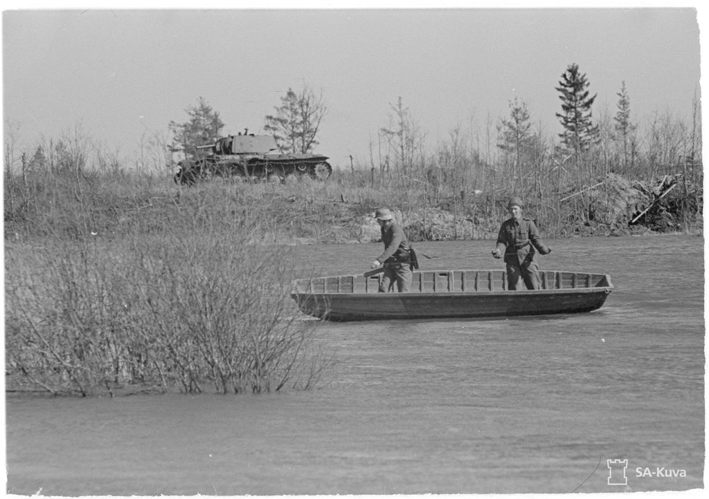 Сложно сказать, в каком месте. Особых примет местности не видно, кроме того, что там нет леса. Солнце светит солдату в лицо слева, вероятно, снимали с западного берега, танк стоит на восточном берегу. Судя по затопленным кустам без листьев, это апрель-май, половодье. Река кажется широкой.