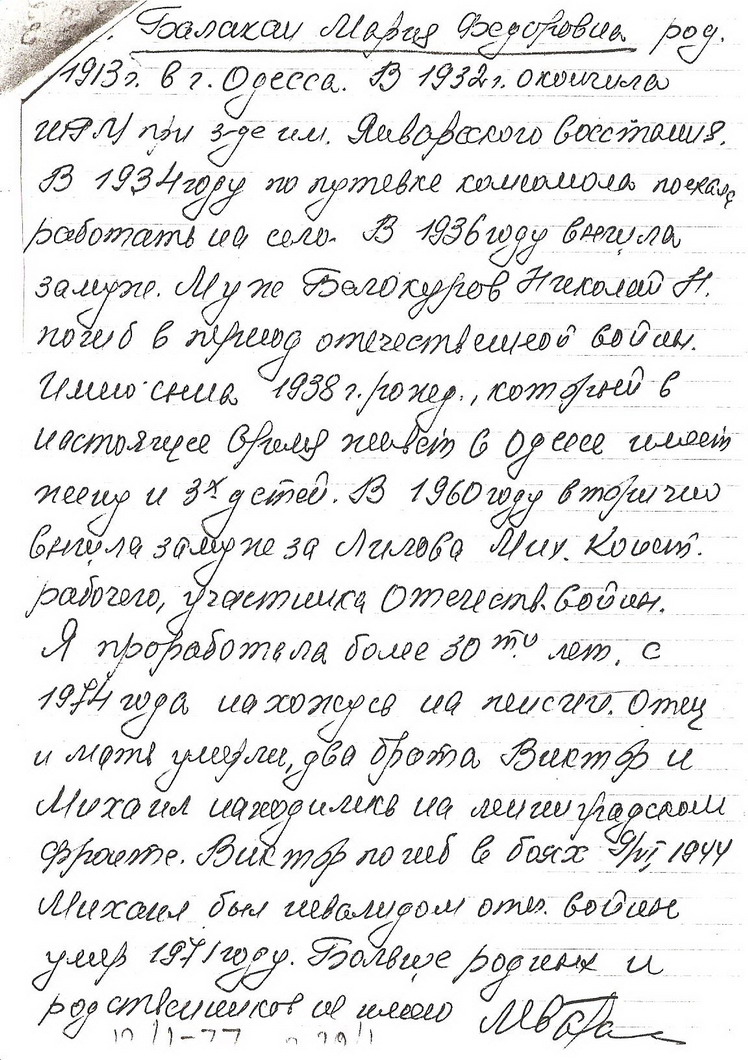 "Сестра- Балакан Мария Федоровна, рожд.1913, г.Одесса, Чернышевского 21/25.