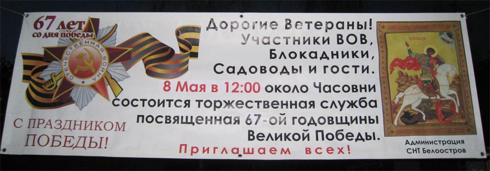 Во-первых: 8 мая 2012г в 12:00 состоится торжественная служба в часовне, недавно воздвигнутой на территории СНТ Белоостров, посвященная 67 годовщине Праздника Победы. Приглашаются все!