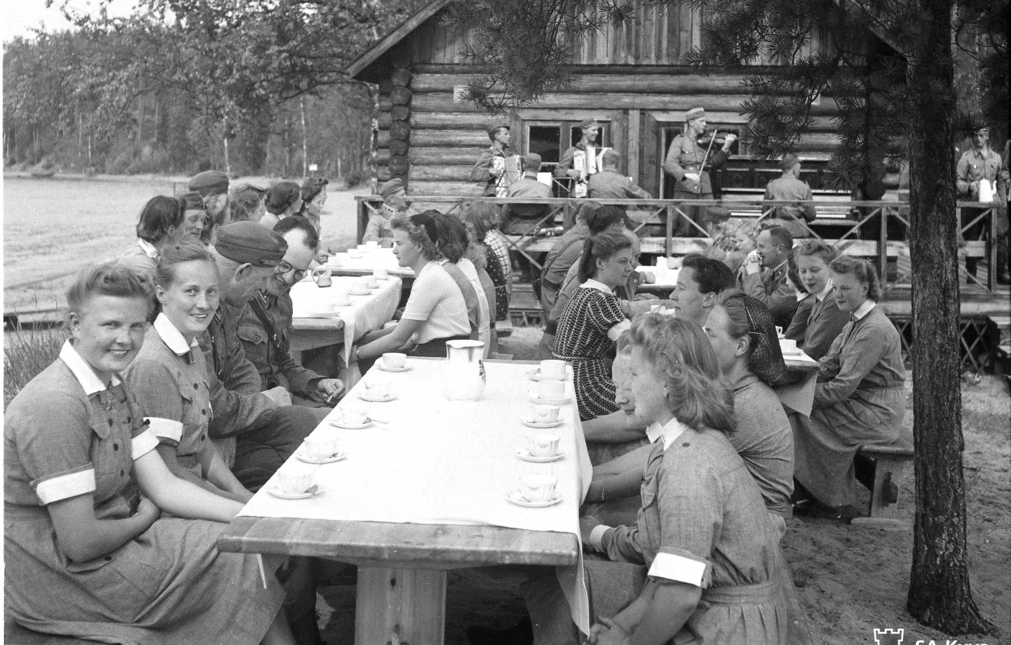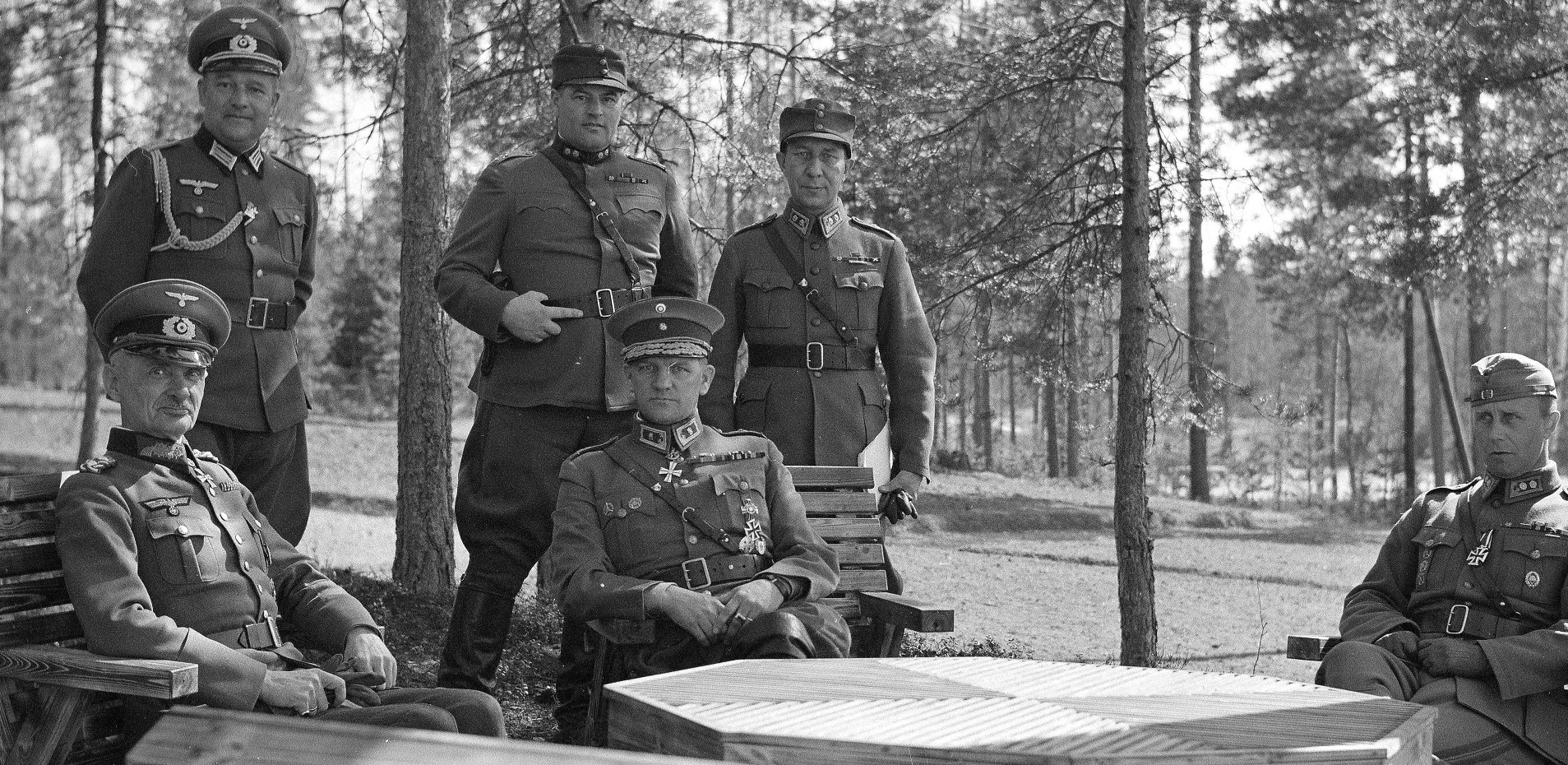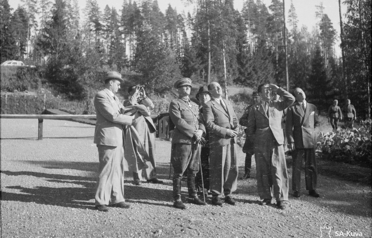 14 октября 1942 года Паяри посетил сам дедушка М со своей свитой. Потом поток не иссякал. Пёрли, кому не лень. Некий итальянский военный фотокор лейтенант Пеллегрини приехал специально пострелять из пекаля. Настрелялся, видно, вусмерть. Потом Пеллегрини еще в архиве присутствует. Геройски позирует на фоне пушки, нацеленной в Финский залив. К Паяри приезжали и братва по оружию. 4 июня 1943 года на побывку прибыли два генерала сс. Один - уже небезызвестный (где-то мелькал в обзоре) Феликс Штайнер. На тот момент он командовал 3 танковым корпусом сс. Про корпус информация разная. Но, вероятно, тогда он формировался-переформировывался и Штайнеру было нечем особо заняться. Второй дядя с очень интересной фамилией – без ста граммов и не произнести. Маттиас Кляйнхайстеркамп. Во как! Тоже, между прочим, группенфюрер сс. Другие к Паяри и не ездят. Он командовал тогда 6 горной дивизией сс «Норд» ( информация на этот счет тоже разная). Дивизия воевала где-то в северной Норвегии. А командир совершал турне в это время по Карельскому перешейку. Ну и Эквист постоянно в этой компании. Заезжал и генерал Эрфурт, награждал отличившихся Железными крестами. Потом обмывали это дело за красивым столом на природе. Приезжали разные гражданские делегации. На фото, похоже, делегация шведского парламента. Они очень любили бывать на перешейке. И, конечно, самый-самый дедушка ( даже дедушковее самого М) Свинхувуд приезжал к Паяри пострелять.