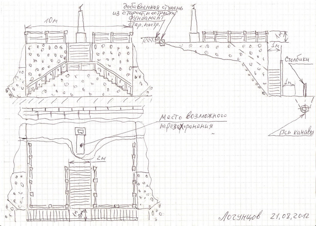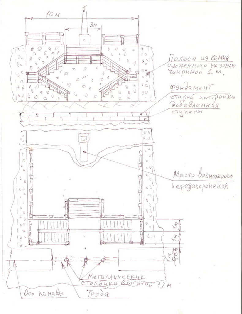 ПОСЛЕ этого уже можно спорить - чей проект облагораживания территории лучше, чей хуже, как грамотнее спланировать прилегающую территорию, как оборудовать лестницу - глядишь, на всё это будут выделены депутатские и бюджетные средства. Нам сейчас необходимо с минимальными затратами засыпать щебень, возвести опалубку и залить плиту под стелу - со сваями или без (как утвердят все возможные привлекаемые архитекторы).