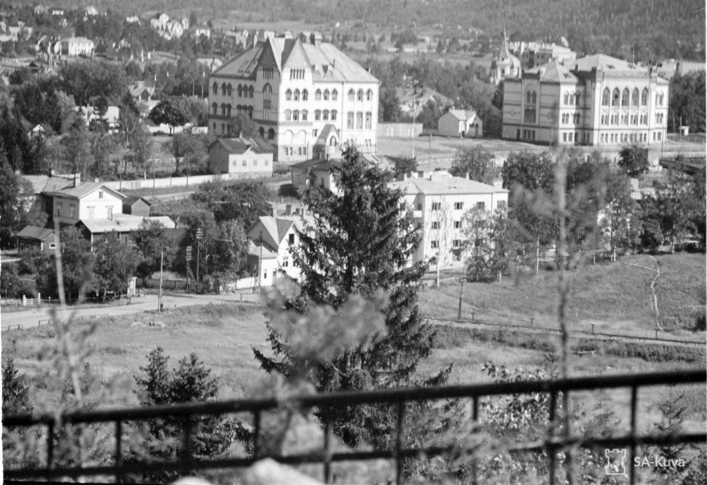 42-43-44 На первом слева дом с башенкой, это улица Кирова, 6. По центру видна каланча пожарной охраны на Карельской 15. На втором видна лесопилка с трубой. На современном снимке видно, что большая труба - новодел. Лесопилка с трубой сохранились. Теперь это неплохая гостиница Пийпун-Пиха (Piipun Piha) по адресу Промышленная, 44. Историю здания можно посмотреть на их сайте.
