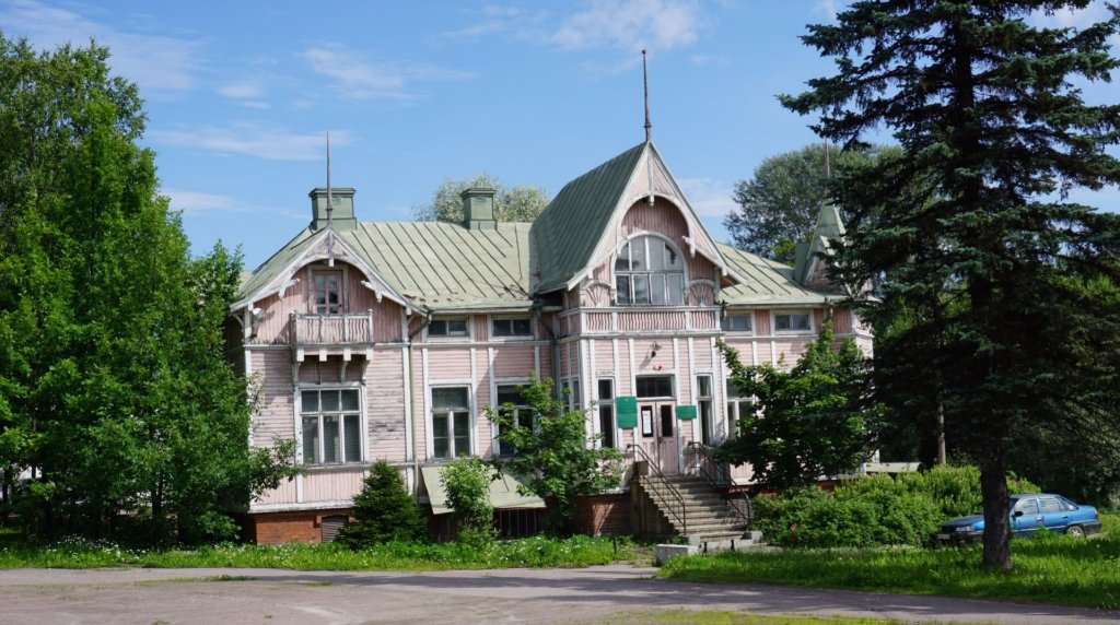 54-55 Старая гостиница при жд станции по адресу Ладожская, 1. Сейчас это местное лесничество. Прямо в лоб не сфотографировать - мешает большая ёлка. Только чуть сбоку.