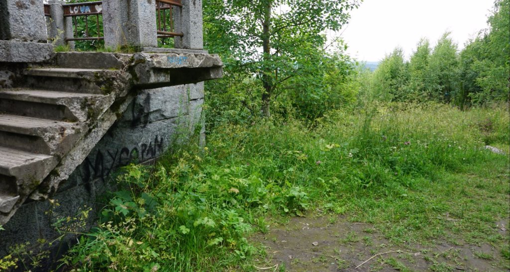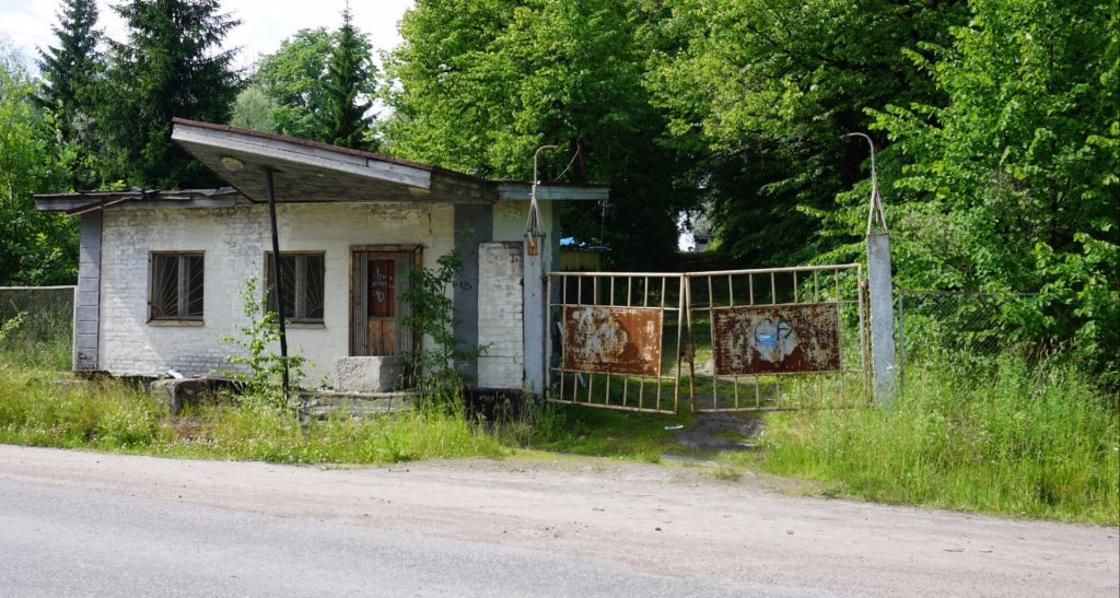 60-61 Госпиталь за заборчиком по адресу Парковая, 5. А сейчас как-то так. Заброшенный КПП, за ним дорожка к госпиталю. Весь парк зарос и здание от дороги не видно.