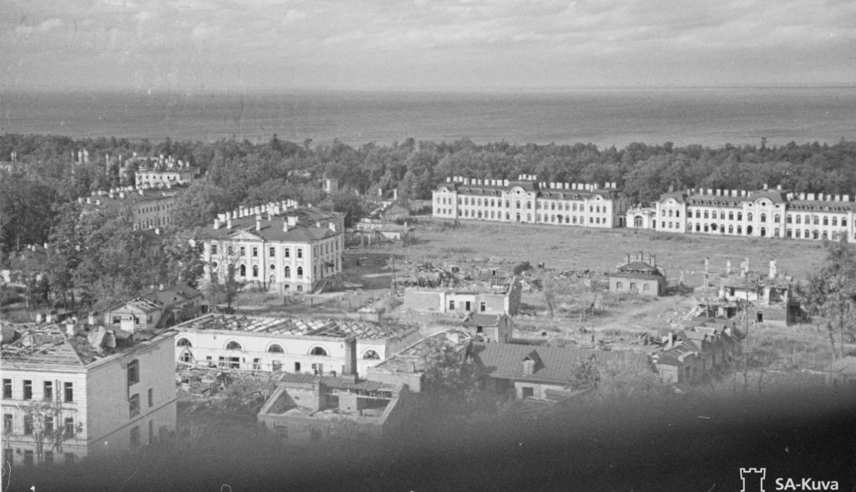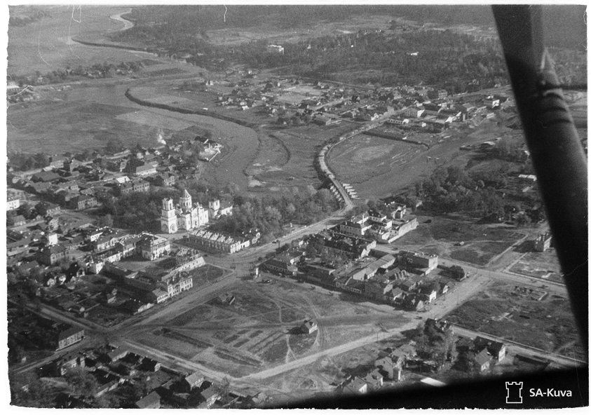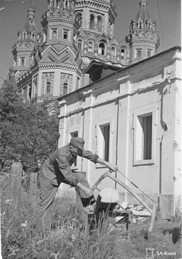 135748 Финн пилит дровишки себе на сауну. А жили они прямо тут-же в церковном дворе. У офицеров был поприличнее - двухэтажный. Посмотрел гуглозем и викимпию - не обнаружил вблизи такие домики. Или не дожили до 1944 года или еще что. Может быть кто помнит