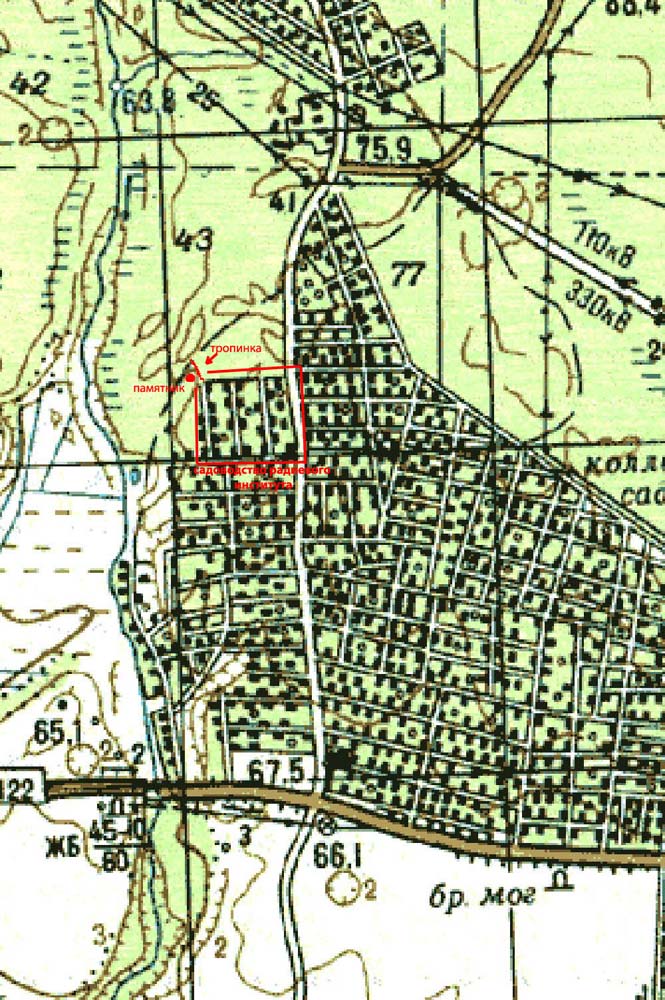 Появились фотографии этого памятника. В воскресенье выложу. Кстати, обновилась и информация о возможных путях прохода к могиле: проще добраться от ж/д магазина (на озерном шоссе). Карту прохода видел.
