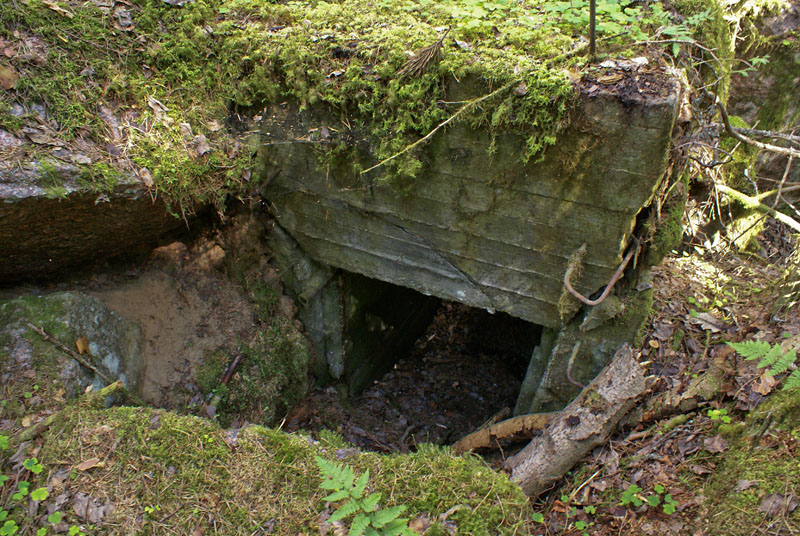 Линия VT – цепочка финских оборонительных сооружений (гранитные надолбы, доты, траншеи, колючая проволока), возведенных в 1942-44 годах. Доты были впоследствии взорваны советскими саперами. Этот дот находится восточнее Щучьих озер, в районе 69 км–Сосново. В предыдущий раз я был у этого дота лет пять назад, а в этом году обнаружил надпись SIRPALEEN KESTAVA на одной из стен укрепления. Хотелось бы узнать, что она означает.