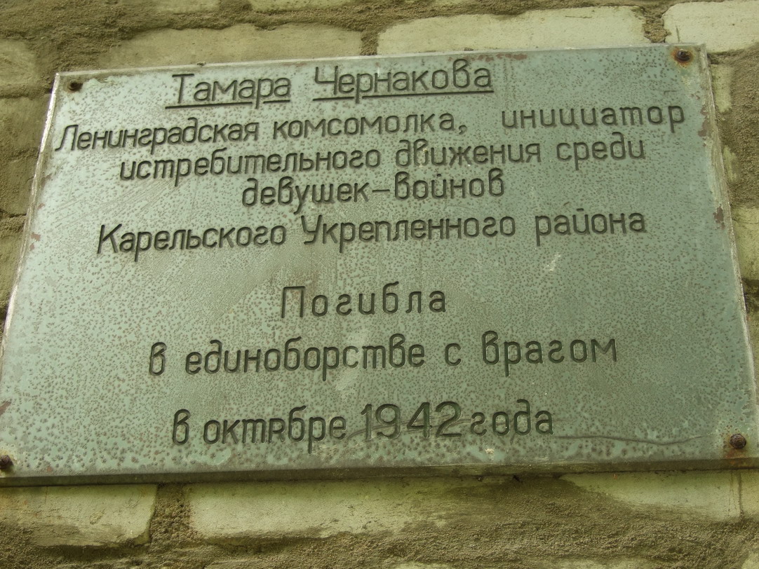 От одного старобелоостровского старожила узнал, что в Черной Речке на одном из домов есть табличка, посвященная гарнизону одного из Мертутьских дотов. Табличка появилась в 50-е годы. Тогда в Мертути стояли военные, мемориала на 38 км еще не было, и табличку повесили в Черной речке. Поиски таблички закончились с отрицательным результатом. Нашел только место, где, возможно, она была. Но нашлась еще одна табличка, посвященная девушке-снайперу. Ее фото прилагается.