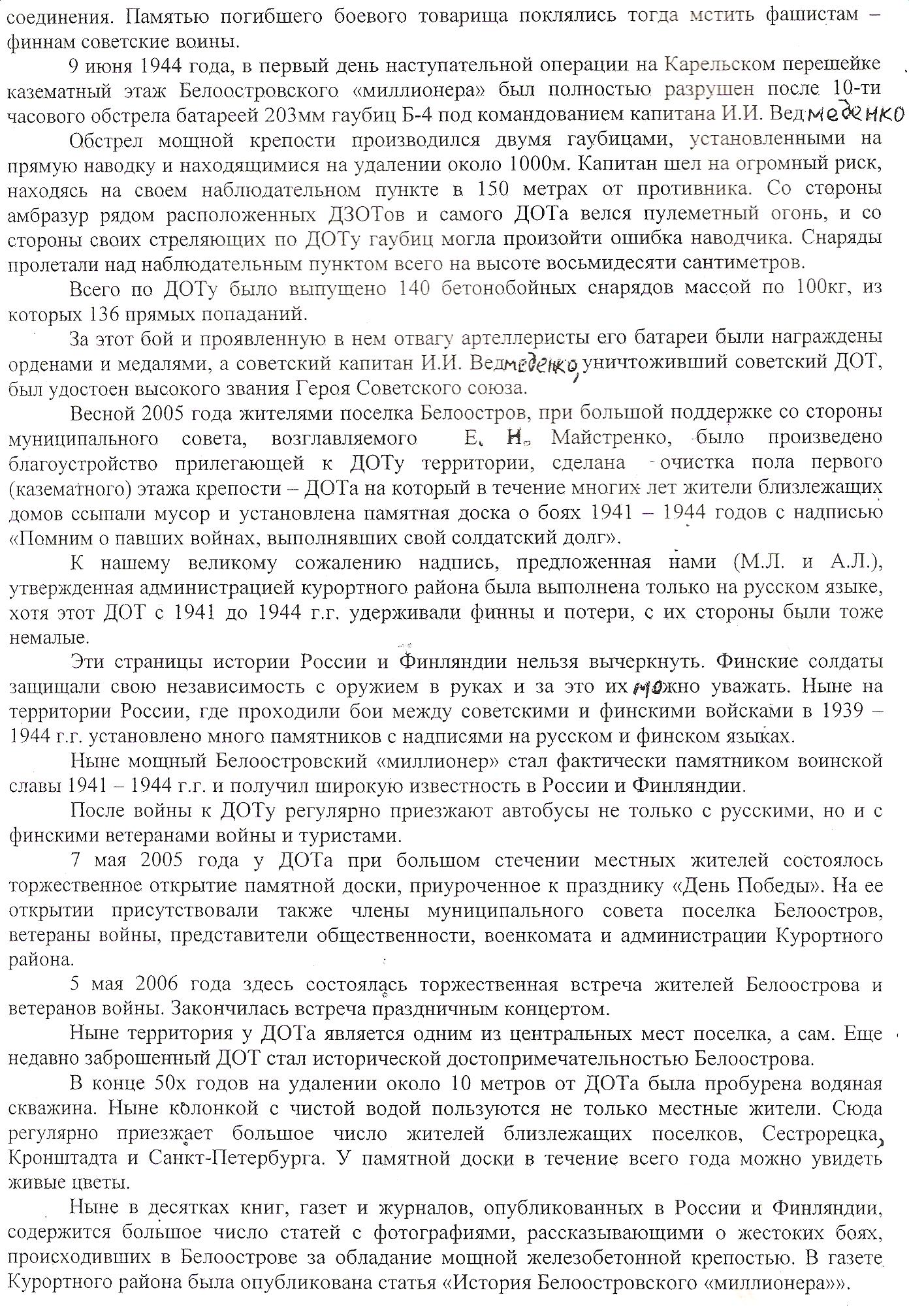 В конце апреля 2005 г. (перед празднованием 9 мая) мне случайно удалось довести до администрации Курортного р-на о существовании в Белоострове исторически знаменитого и боевого "Миллионного" ДОТа, имеющего трагическую историю, как с русской, так и финской стороны. Дальше все произошло "бегом". Я сообщил историю ДОТа и дал текст надписи на предполагаемой к установке памятной доски на ДОТе. Предполагал, что текст будет на русском и финском языках.
