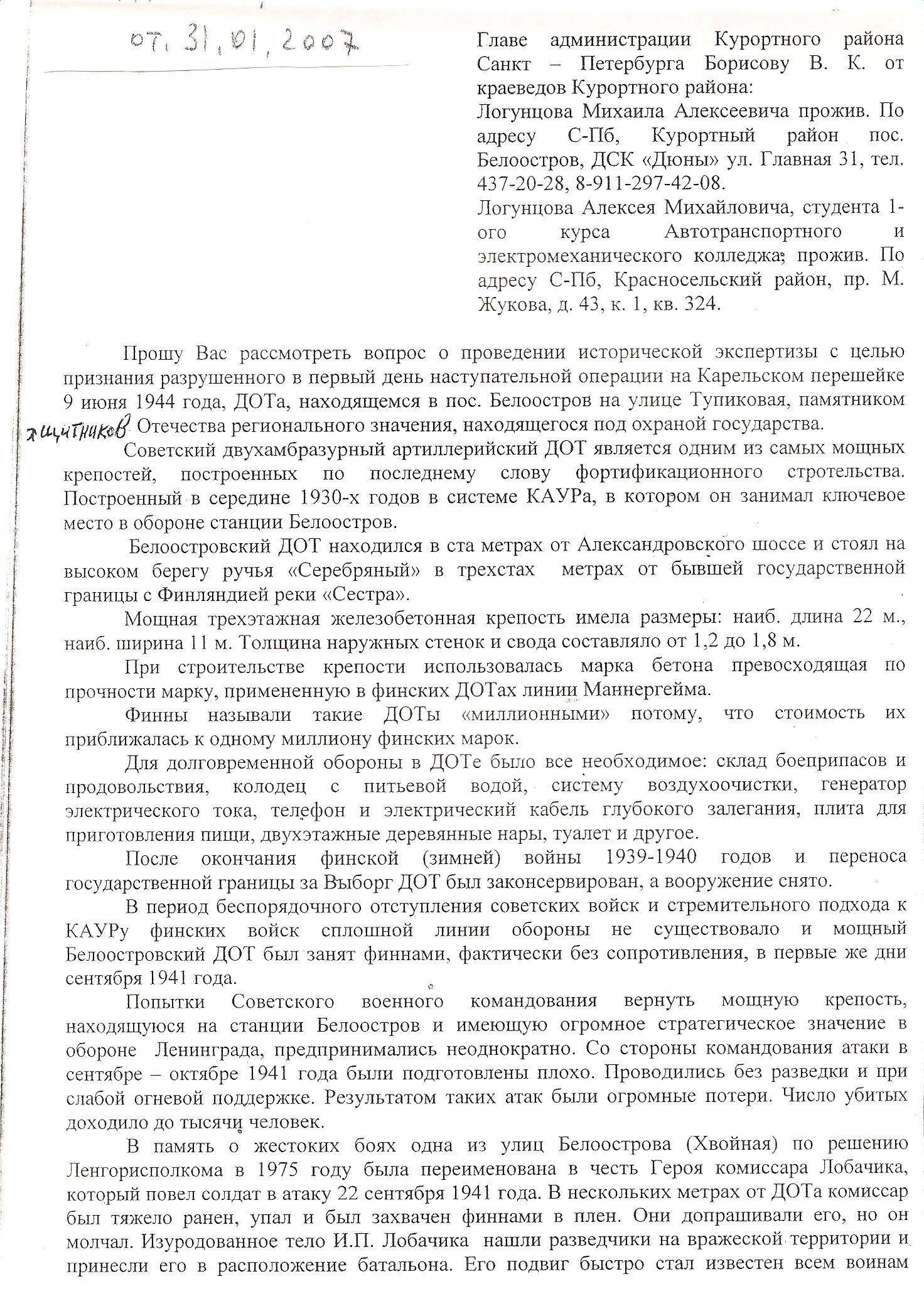 В 2006 г. краеведы Курортного р-на М.А. и его сын А.М. Логунцовы, видя, что ДОТы Карельского укрепрайона стали усиленно продаваться под коттеджи, решили обратиться к главе администрации Кур. р-на о признании Белоостровского ДОТа "Миллионера" памятником Регионального значения (см. приложение)