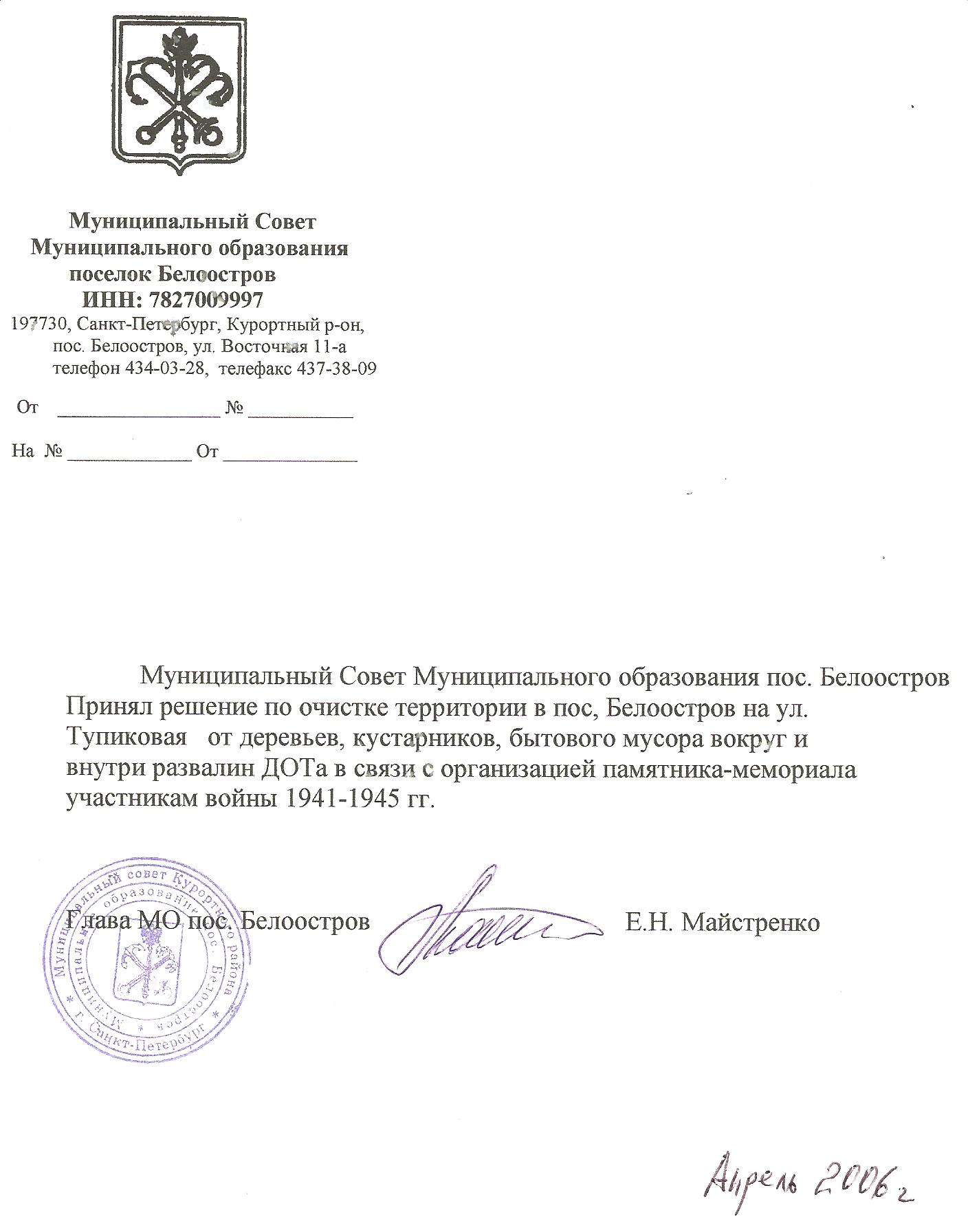 P.S. На прикрепленном листе, в надписи, сделанной от руки ошибка. Правильно апрель 2005.