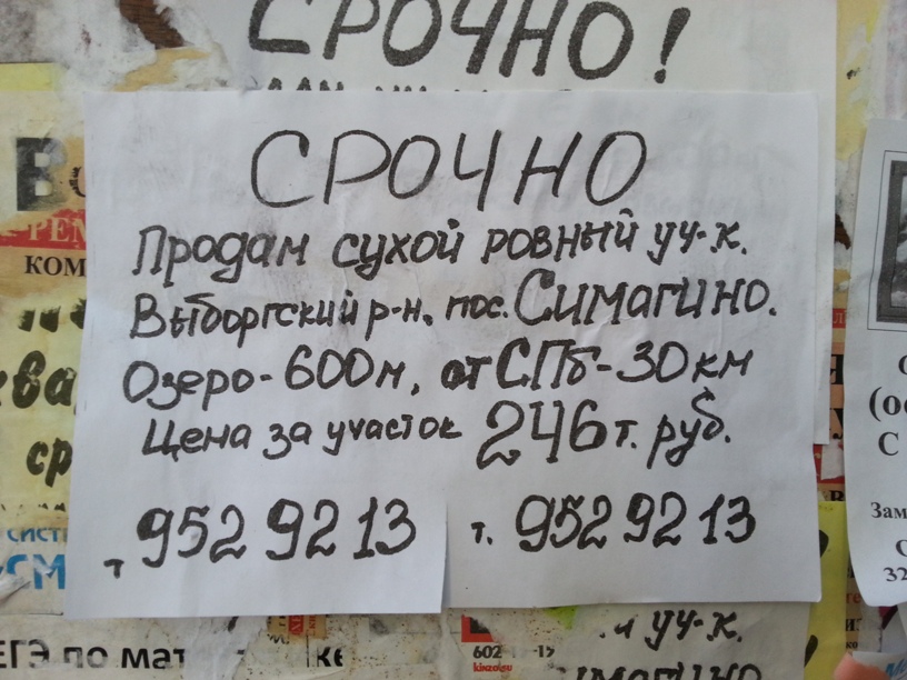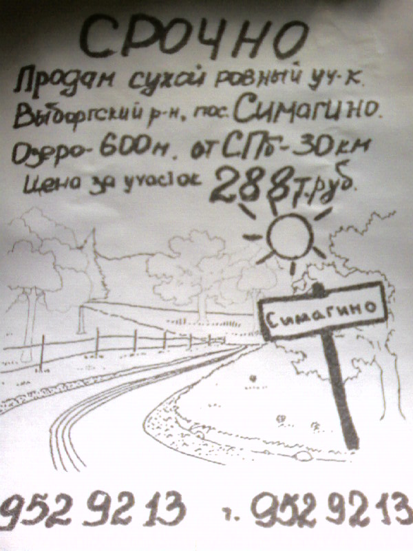 Во, блин, и у меня такое сегодня повесилиOsbourne писал(а):Вот такое объявление висит у меня в городе на парадной. Цена - более чем скромная. Правда, не Белоостров, а Симагино. На фото видно, что это уже третье объявление - два предыдущих под ним были сорваны. Написано "срочно". Не знаю, может какие проблемы с документами..