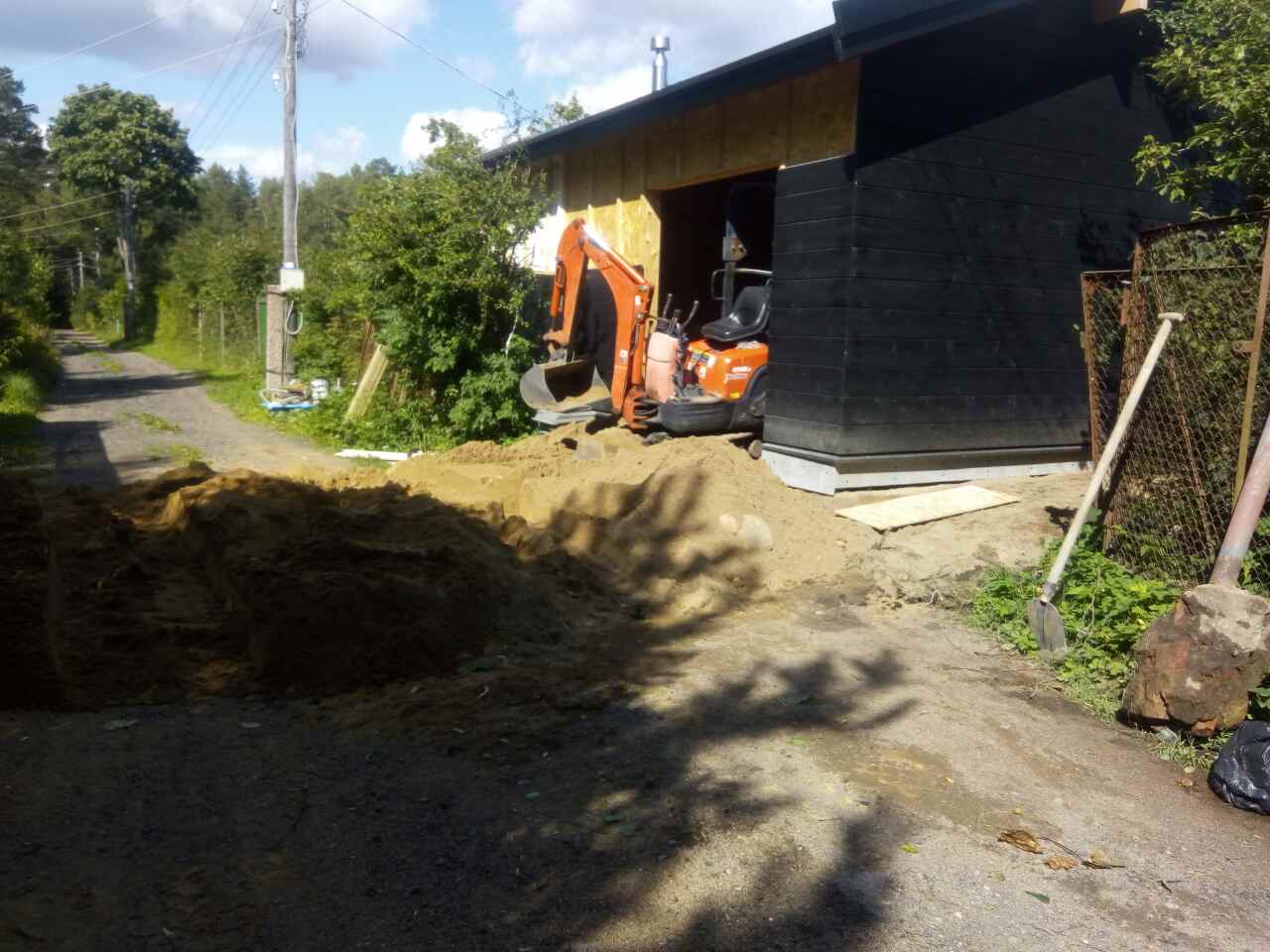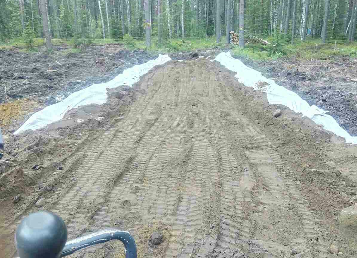 Местами песок, местами затягивало даже миниэкскаватор. Далее подсыпка песка, дорнит, щебень.