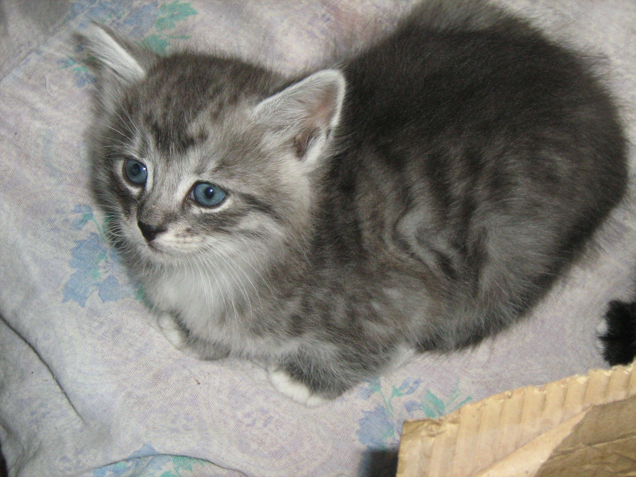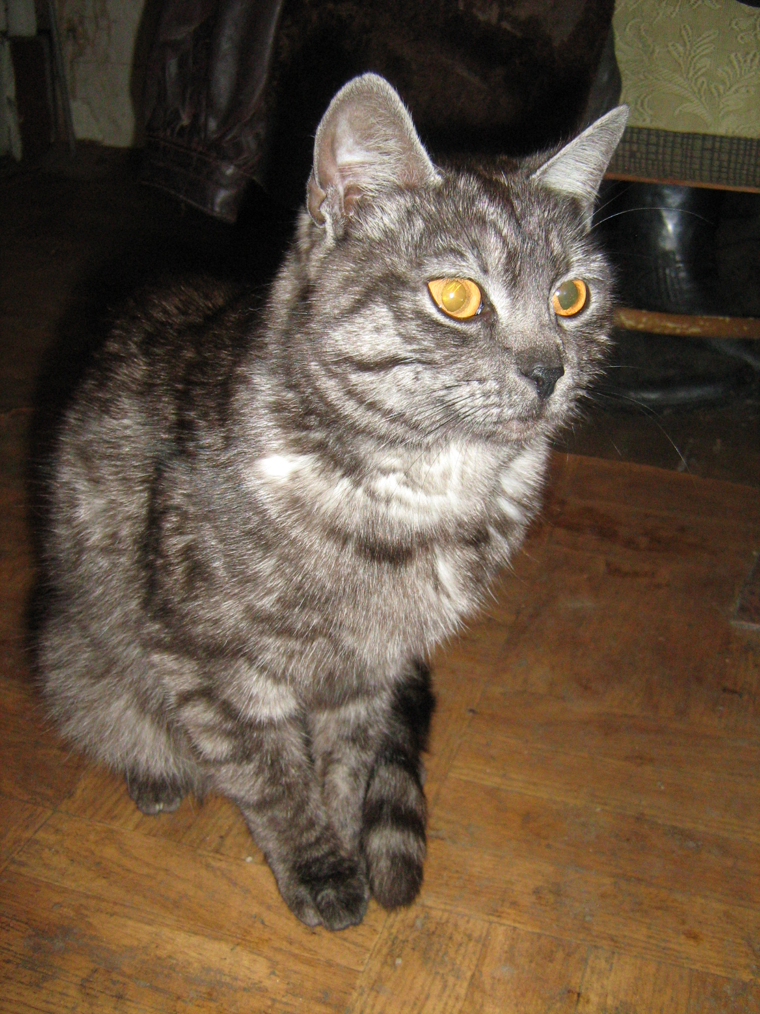 В начале июня 2012 в п. Белоостров (Сад-во Композит-1) прибилась (найдена) кошка. Небольшая, полудлинношерстная, дымчато-полосатая (спинка темно-серая, подшерсток светлый, почти белый), глаза ярко-оранжевые большие (Очень похожа на метиса британца), лапы длинные. На вид не больше года (может быть и 1,5, тело длинное, но кошка очень худая)