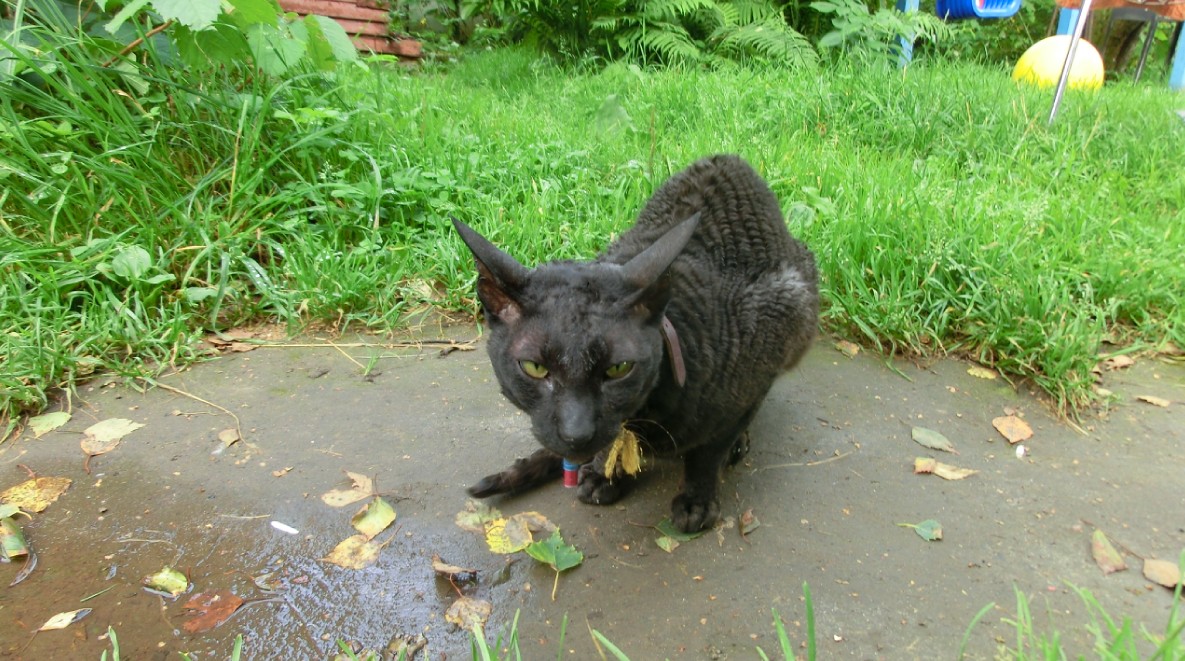 Чёрная наглая киса бродит четвертый день по участку периодически пропадая. В доме пытается взлезть на стол и чего-нибудь с него сожрать. Приходится теперь держать все двери закрытыми. Никого не боится. Носит черный кожаный ошейник с какой-то открывашкой для пивных бутылок (?) и украшение из зеленой пушистой штукенции. Виляет хвостом как собака.