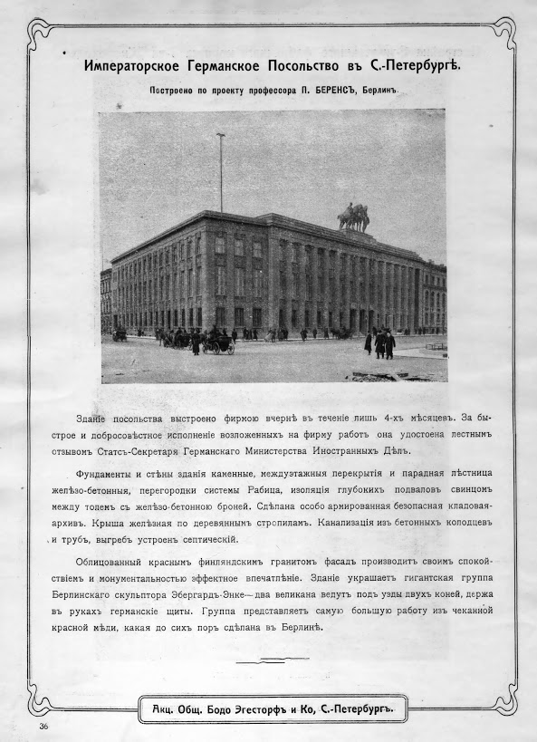 В сети обнаружилось несколько упоминаний о постройках, выполненных конторой Эгесторфа. Более или менее значимых. Например, упоминавшаяся выше фабрика "Скороход" и здание её магазина на Петроградской стороне, усадьба Ланских на углу Энгельса и Ланского шоссе, гаражи Крюммеля на Дивенской и на Ковенском, а также знаменитое здание немецкого посольства на Исаакиевской площади.