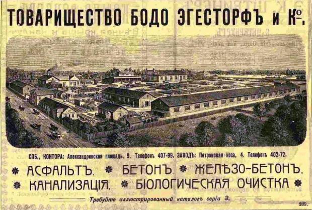 Был такой Бодо Эгесторф. Германский подданный. До сих пор на улицах Петербурга можно встретить канализационные люки с его именем. Изящные, со вкусом сделанные. Он имел производство на Петровском острове. Занимался всякими строительными делами - бетонированием, асфальтированием - не только канализацией. Его коллеги в то время объединяли свою специализацию таким же образом - как правило, рекламировали себя именно в этих трёх областях. Но этот гражданин преуспел, видимо, побольше некоторых - его называли даже "асфальтовым королём".