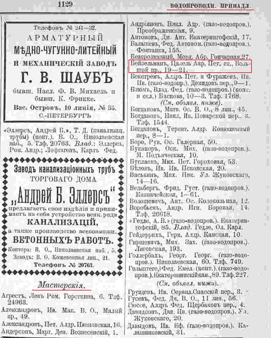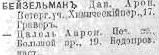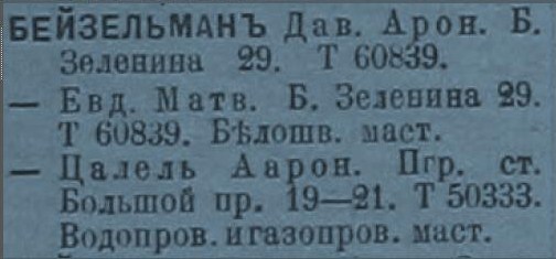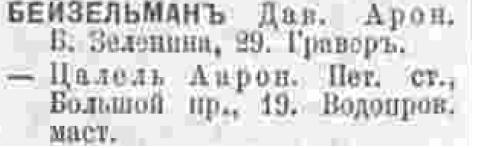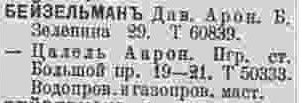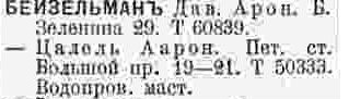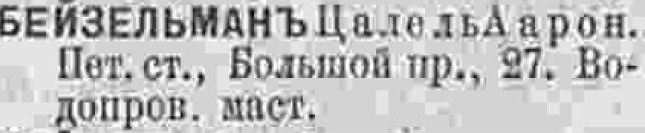 Короче, у Арона Бейзельмана было в Петербурге два сына - Давид и Цалель. Т.е. сначала был только Цалель, с 1906 года он там был. И имел водопроводную мастерскую на Большом П.С. , 27.