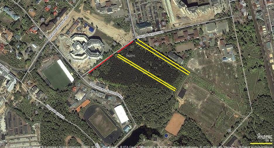 Присутствует поле бывшего Комендантского аэродрома во всей красе, видна трасса Детской ж/д, Светлановский пр. обрывается у Тихорецкого пр...