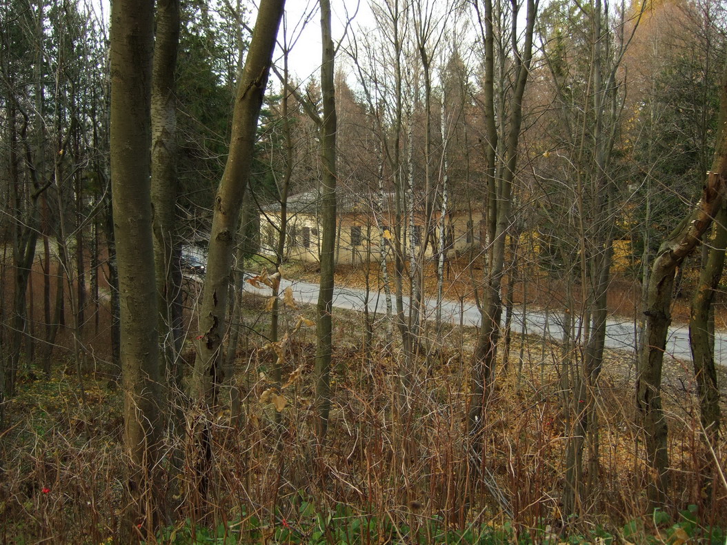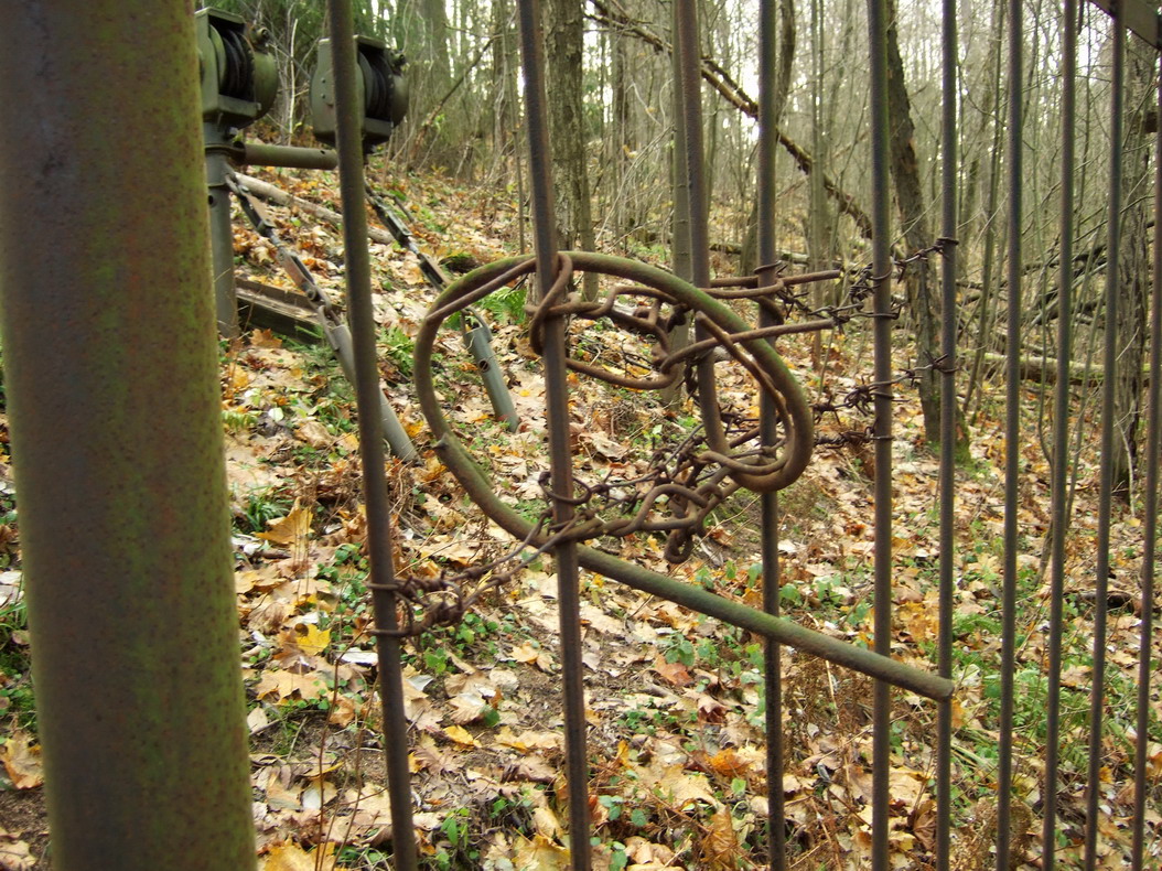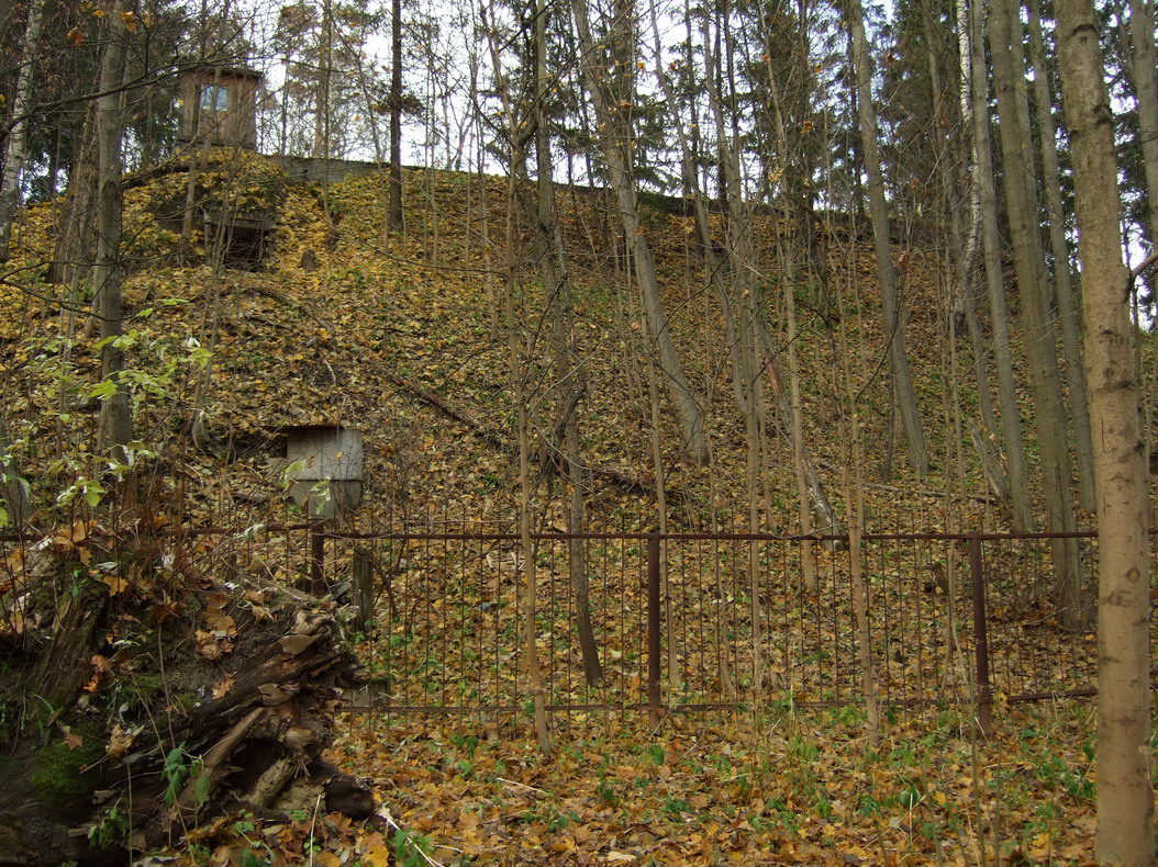 Немного в стороне от усадьбы находится еще одна высокая горка. Огорожена забором, ворота на замках. На вершине горки видно большое бетонное сооружение, зарытое в землю, с несколькими входами. Попыток перелезть через забор нами не предпринималось. Боялись наколоть пупок острыми наконечниками. Там может находиться полузаброшенный узел связи.