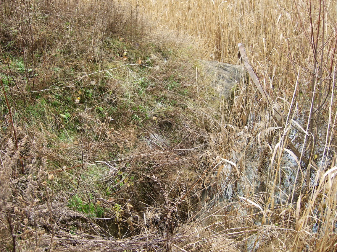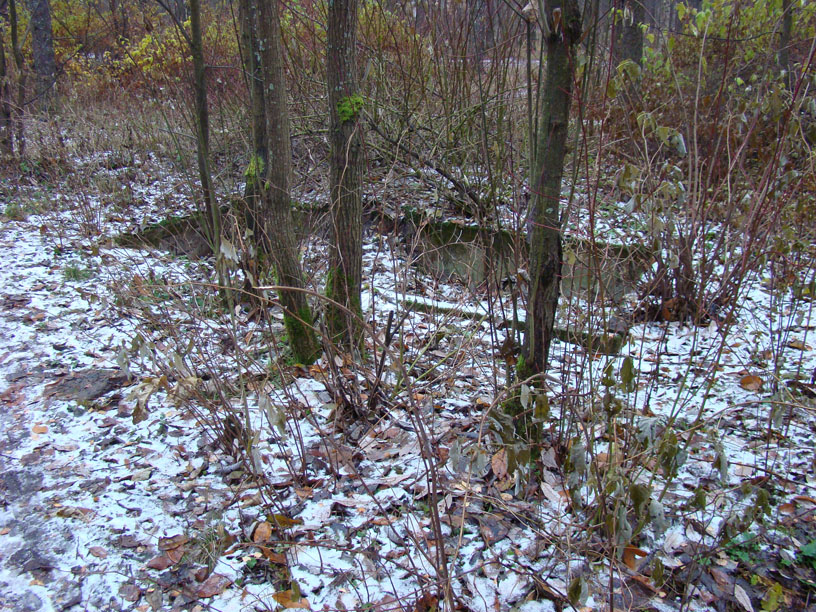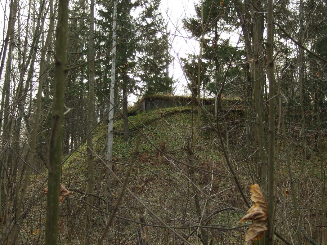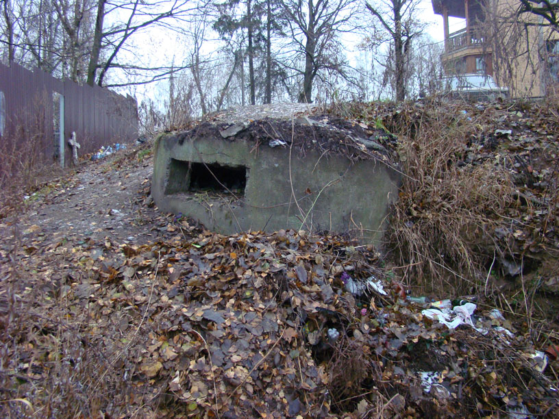 Дот находится ниже уровня окружающего его грунта. Или осел в болотной жиже, или его засыпали строительными отходами. Обнаружить можно только с трех-четырех метров