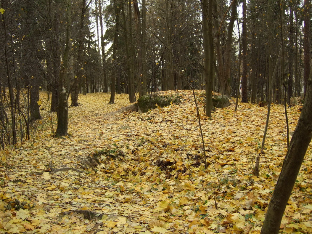 Убежищ или входов семь. Расположены здесь же между дотами, кроме одного. На территории парка есть гора Парнас, которую крепостные графа насыпали вручную. Под ней тоже была система подземных сооружений, засыпанная в 90-е годы. Во многих местах из-под земли торчат трубы разного диаметра. Их назначение сейчас не установить. Получается, что вся эта холмистая местность перекопана подземными ходами. На территории множество воронок. То ли от снарядов и бомб, то ли от обрушения ходов.