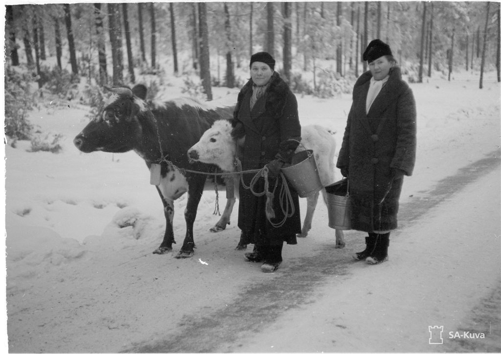 На эвакуируемых они действительно не очень похожи, особенно та, что справа. На ней вообще, по-моему, форма лотты (так же, как и на велосипедистке). Лотты, как мы опять же знаем, оставались на местах. Так что куда они идут - ещё вопрос. А вот коровок-то мужики (в валенках