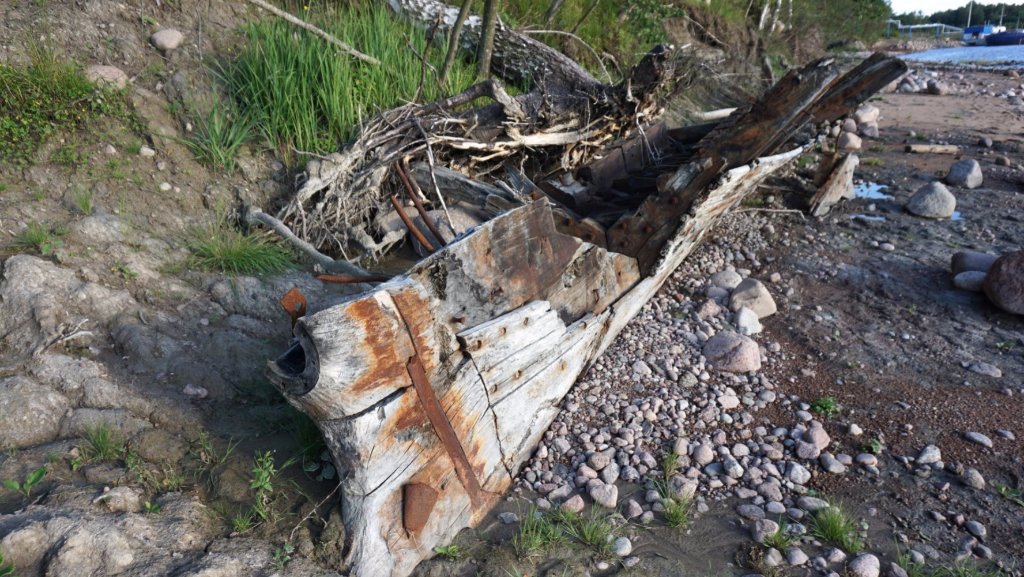Основной достопримечательностью Сойкинского полуострова является, конечно же, ВМБ Ручьи. Вернее то, что от нее осталось. А осталось от нее немного. Из-за нехватки времени ( ездили одним днем, туда-обратно километров 250) удалось посмотреть только участок берега и водных сооружений в районе Вистино. Здесь почти ничего нет. Вдали от берега видны несколько или кессонов, или бетонных блоков, торчащих из воды. Это остатки, наверное, причальной стенки или волнореза. На берегу валяется несколько деревянных корпусов старых рыбацких баркасов или очень больших ялов разной степени разрушенности. К Ручьям, где и сосредоточены основные остатки береговых сооружений, доехать уже не удалось. Там же лежит и оригинальная подводная часть корпуса Авроры, которую отрезали еще при первом ремонте. Про ВМБ Ручьи и Аврору писать не буду здесь. В сети полно материалов на обе темы. Там же на берегу около нынешней Авроры были сделаны несколько фотографий из СА-кувы. Об этом будет в соответствующей теме.