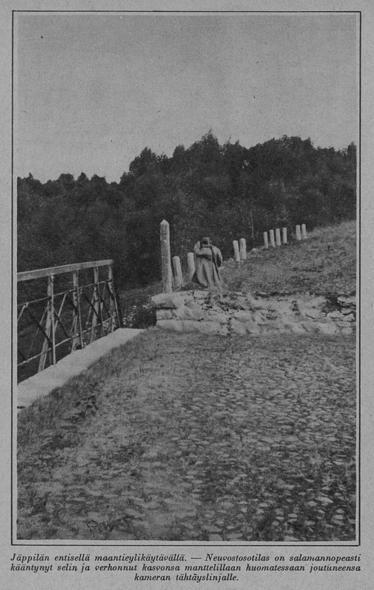 Фото из финского журнала 1931 года. Советский пограничник закрывается от камеры. Дорога булыжная и заросшая. Мост был взорван в июне 1919-го.