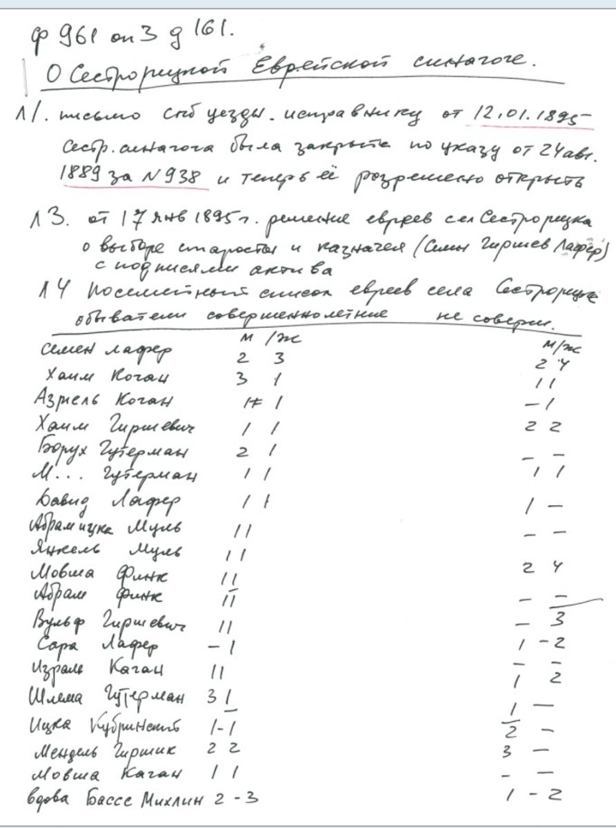 Написано что 17.01.1885 был признан староста прихода-Семён Гиршевич Лафер. Возможно он и был старостой до закрытия синагоги. Для меня самое интересное кто такой Шлема Гутерман и кто такой М... Гутерман? Сын или жена Боруха? Может кто-то знает или это уже обсуждалось, расскажите мне