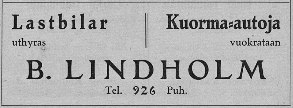 Нашел только с предпоследнего снимка. В рекламном издании 1940 года присутствует B. Lindholm. Он сдает в аренду автотранспорт. Контора находилась в Порвоо.
