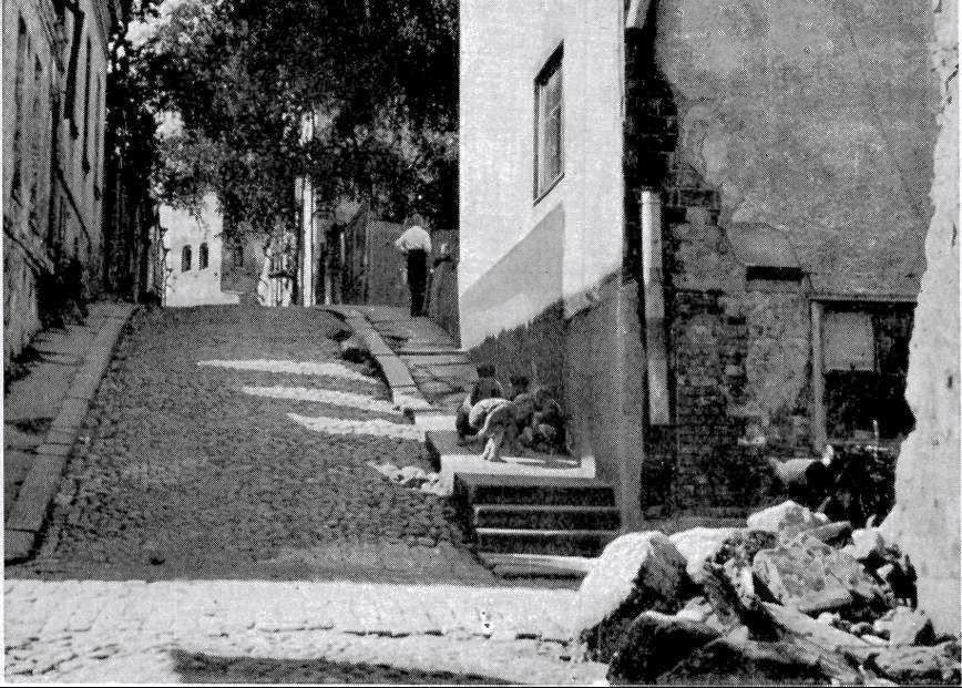 Ещё одна фотография Крепостной улицы, как бы продолжение первой. Обращают на себя внимание (на обеих фотографиях) оголовки печных труб, не говоря уже о шпилях, балконных решётках, и, конечно, кованой рекламе на крыше углового дома. Фонари подвешены над улицей, что кажется вполне разумным: и освещённость равномернее, и торшеры места не занимают на узких тротуарах
