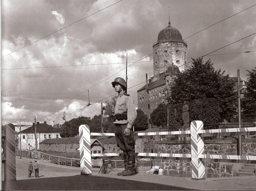Vartiosotilas seisoo pavartion edessa:. Kuva kertoo, etta: vanha vena:la:inen linnoitus oli nyt tukevasti itena:sen Suoimen sotilaiden ka:sisa: