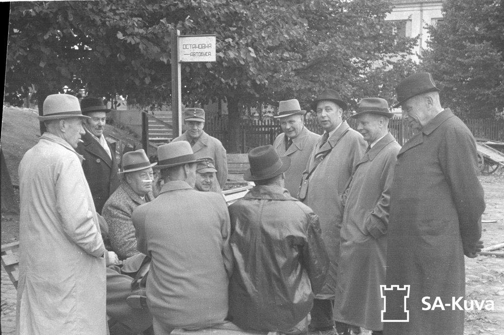 Весьма солидные дядьки, не похожи на репортёров. На автобусной остановке у вокзала в Терийоках.