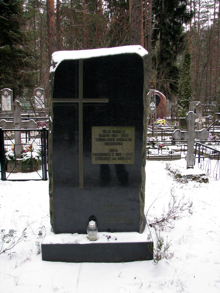 Поскольку памятник, вероятнее всего, ставился в наши дни, совместно или, по крайней мере, по согласованию, возникает вопрос: действительно ли в 1912-1939 гг там хоронили только финнов? И если - да, то почему бы не отразить это в русском тексте? А если - нет, и хоронили и других, то зачем было надо выделять национальную принадлежость кладбища?