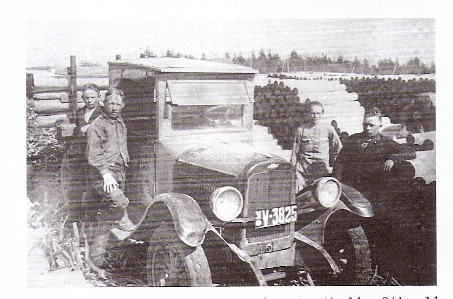 Аксель Бергхольм (сын А.В.Бергхольма) с женой, младшим братом и работником в Линтула (как я понял, на лесобирже) у своего грузовика. "Шевроле", однако.