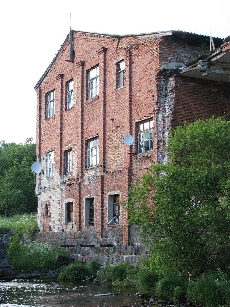 Там же неподалеку, на берегу речки Селезневки, находятся останки бумажной фабрики - Hovinmaan paperitehdas. Основана в 1873 году, пострадала в войну, но вроде как после войны тоже работала, ибо не думаю, что иначе здание бы сохранилось до наших дней. Очень живописно стоит на берегу, внутри сушится бельишко, а на обшарпанных стенах - спутниковые тарелки местного пролетариата.